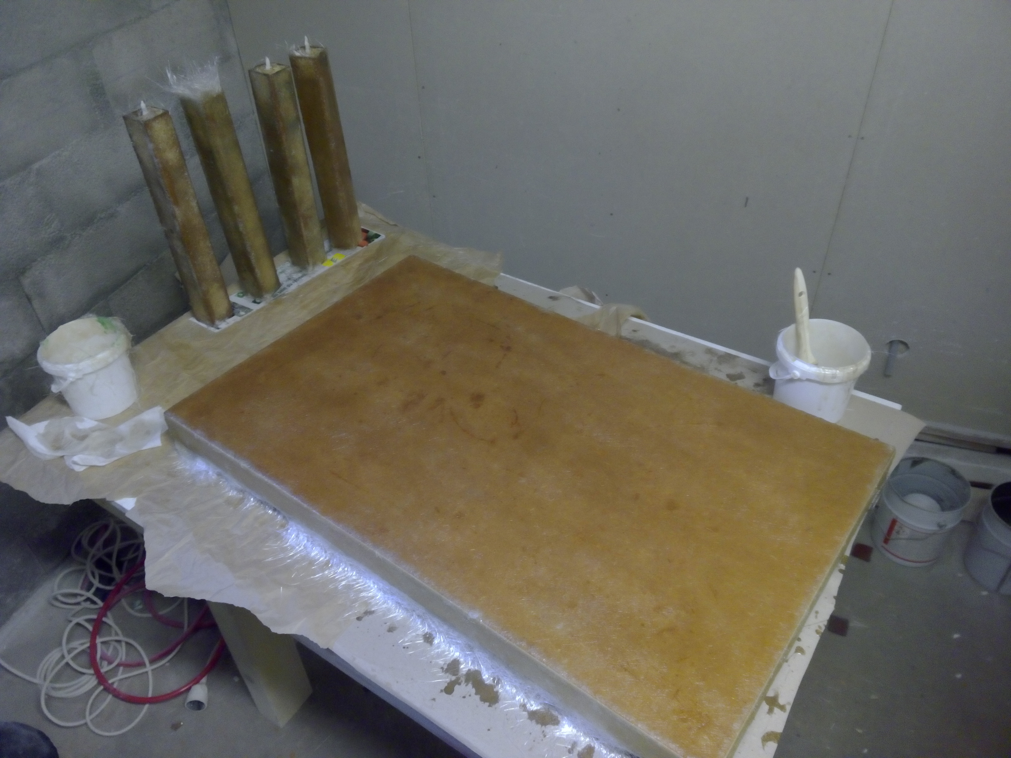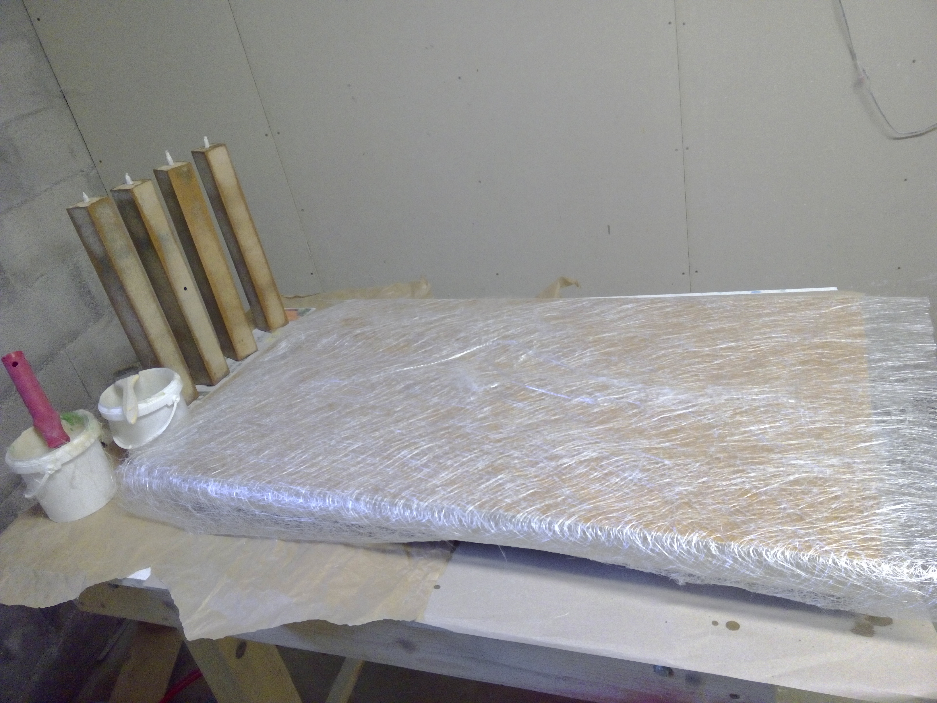 Ensuite il faut savoir sur quoi vous allez stratifier : si c'est du carton ou un bois traditionnel, il faudra faire une couche d'imprégnation résine catalysée + 10% d'acétone pure avant pose du tissu choisi.