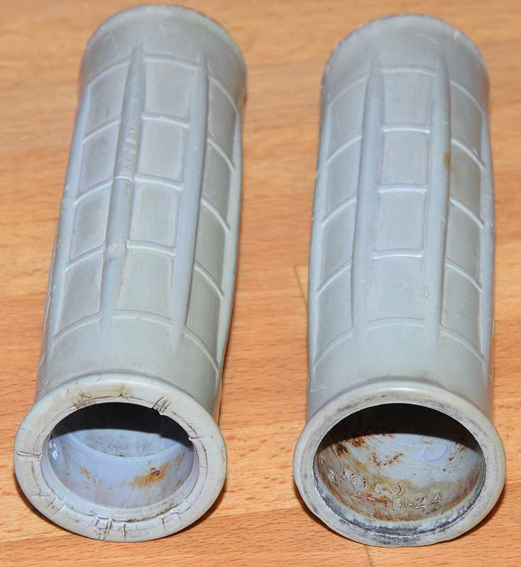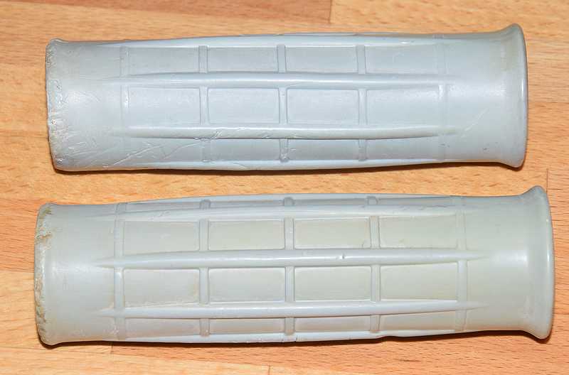 Je cherche à reproduire en petite série des poignées de cyclo devenus introuvables aujourd'hui, à l'origine la matière était plus brillante que ce qu'elle est devenue, et relativement ferme sans être pour autant du "plastique dur". Couleur gris clair d'origine. Les 2 poignées D et G sont identiques extérieurement, mais le diamètre intérieur est différent entre D et G.