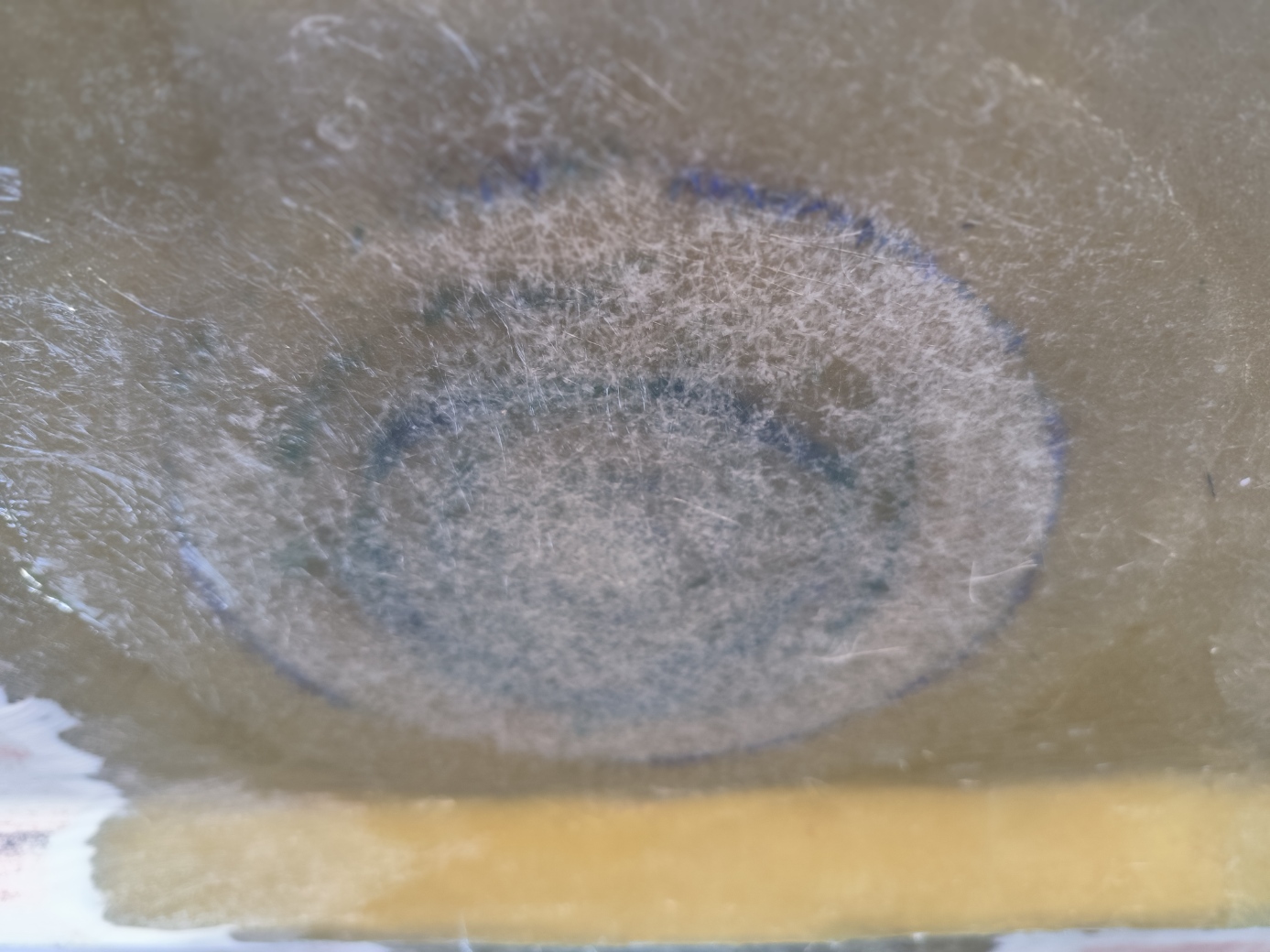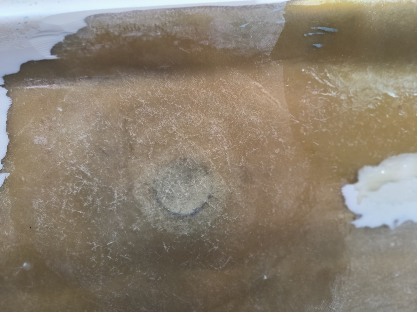 Au séchage, on peut voir que le mat est devenu blanc. On m’a dit que cela signifiait que je n’avais pas mis assez de résine. (Voir photo !)