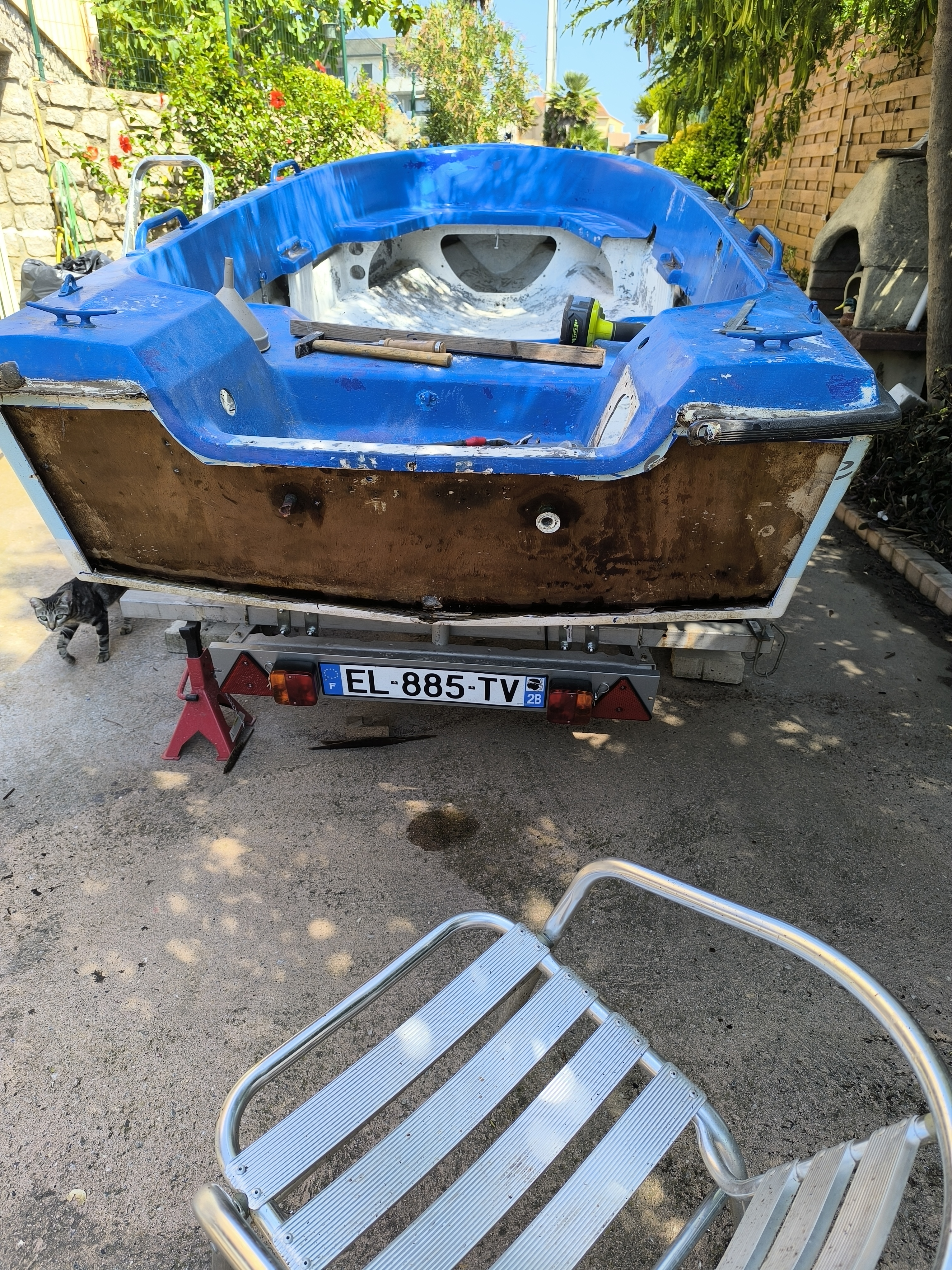 Cette barque est en polyester donc pas d'époxy ; l'époxy ne se stratifie pas avec du mat et le top-coat ne tient pas dessus.