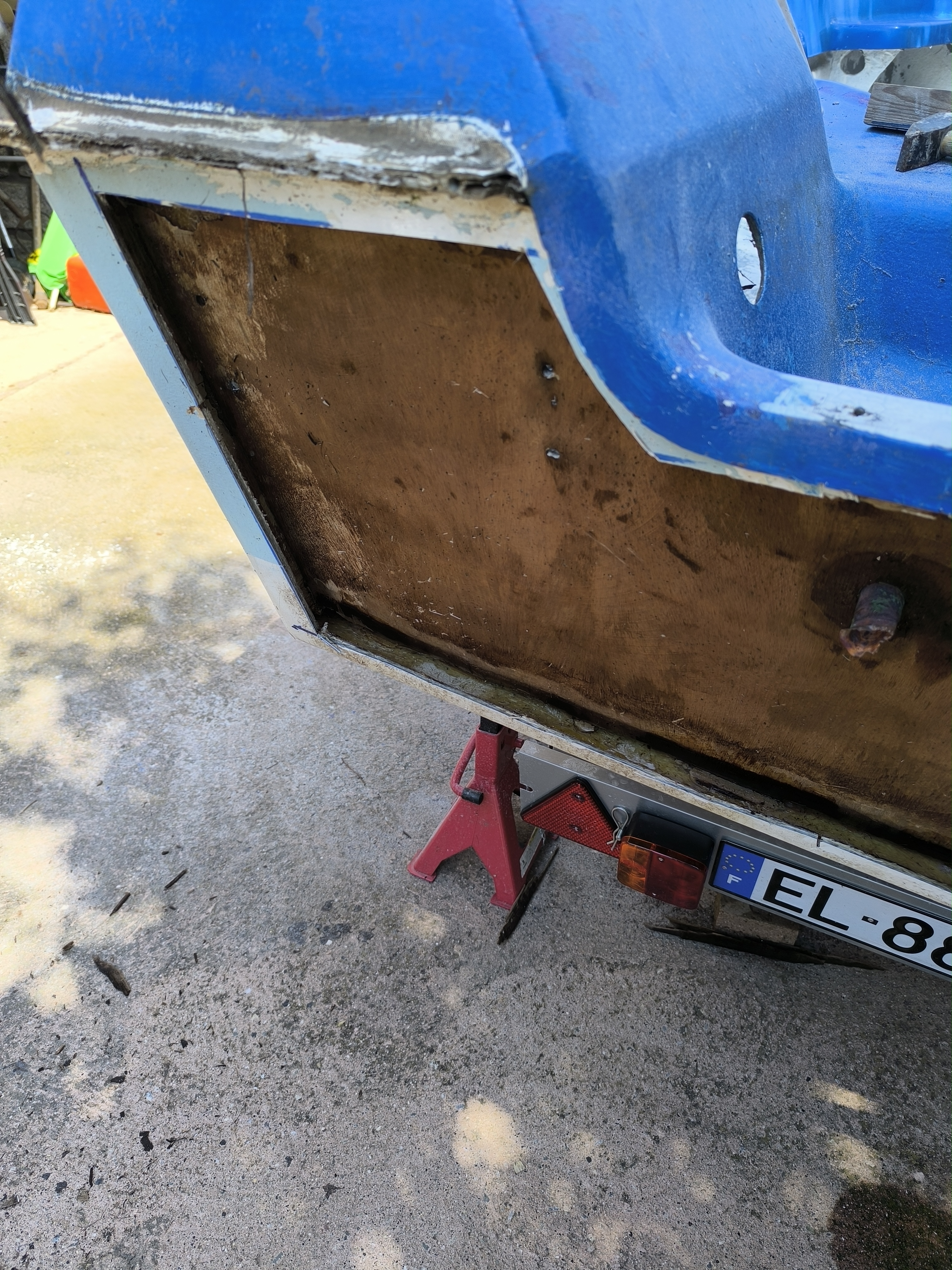 Malheureusement les bords pour accrocher la stratification de ce tableau arrière que vous aurez préalablement fabriqué sur moule sont bien trop étroits donc il faudra aussi poncer et reprendre sur la coque.