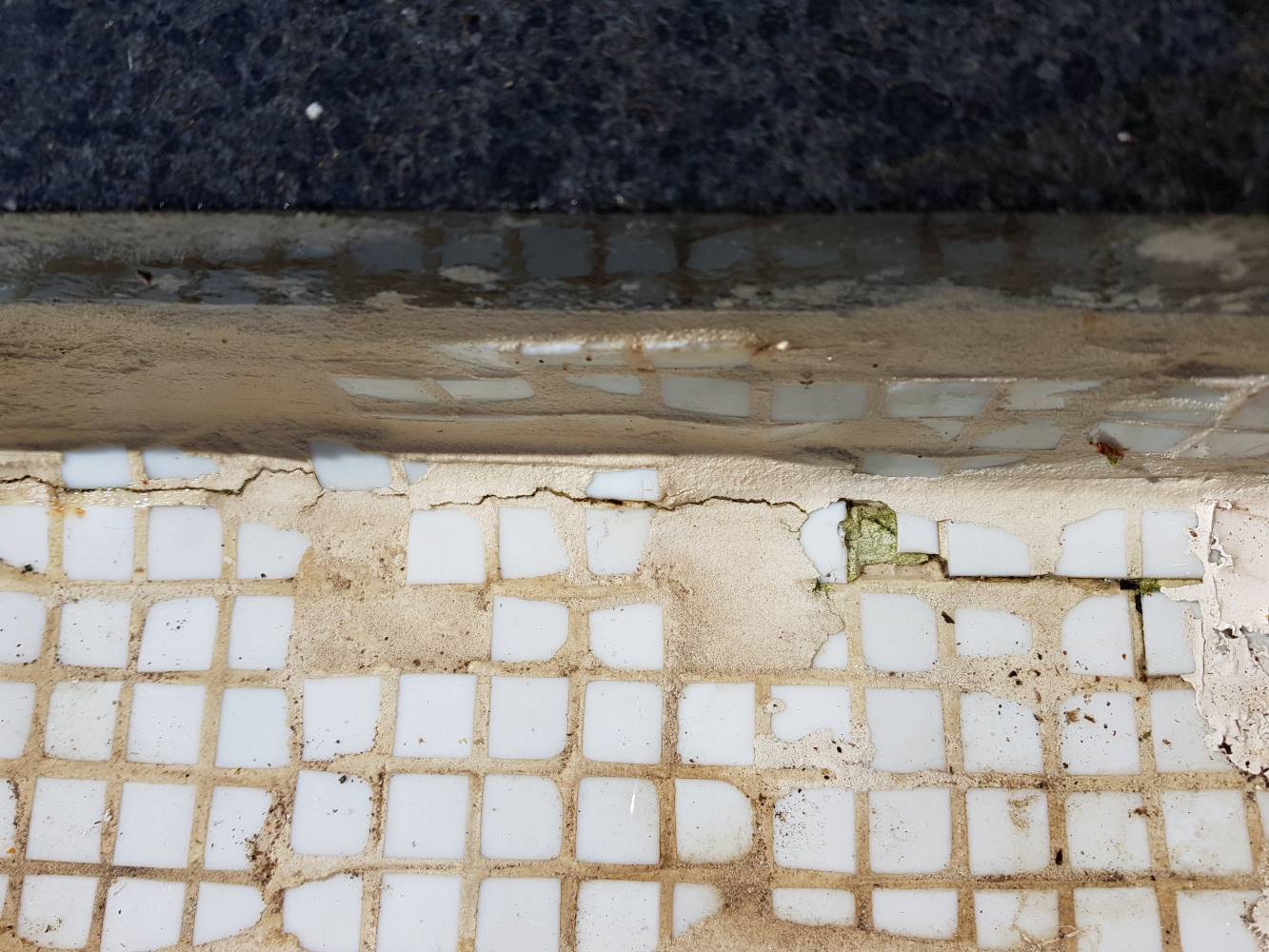 D'après vos photos, les fissures sont assez larges et profondes. Il semblerait qu'il faille ôter complètement les mosaïques et le ciment-colle qui les maintient encore un peu et de voir comment ça se présente dessous. J'imagine que c'est le ciment de ragréage qui doit être abimé par les fuites aussi il faudrait le poncer et faire une étanchéité dessus avec une stratification mat de verre-résine polyester isophtalique puis recoller des mosaïques neuves dessus avec une colle appropriée ou bien passer d'abord un gel-coat puis un top-coat de finition.