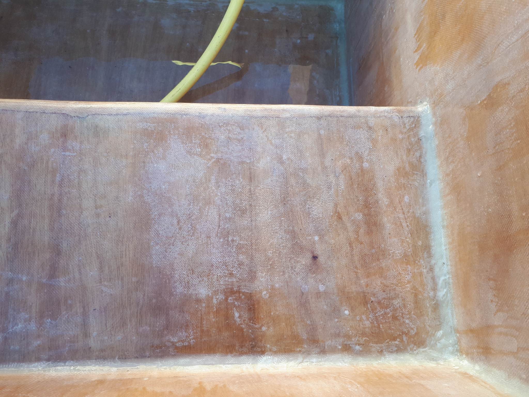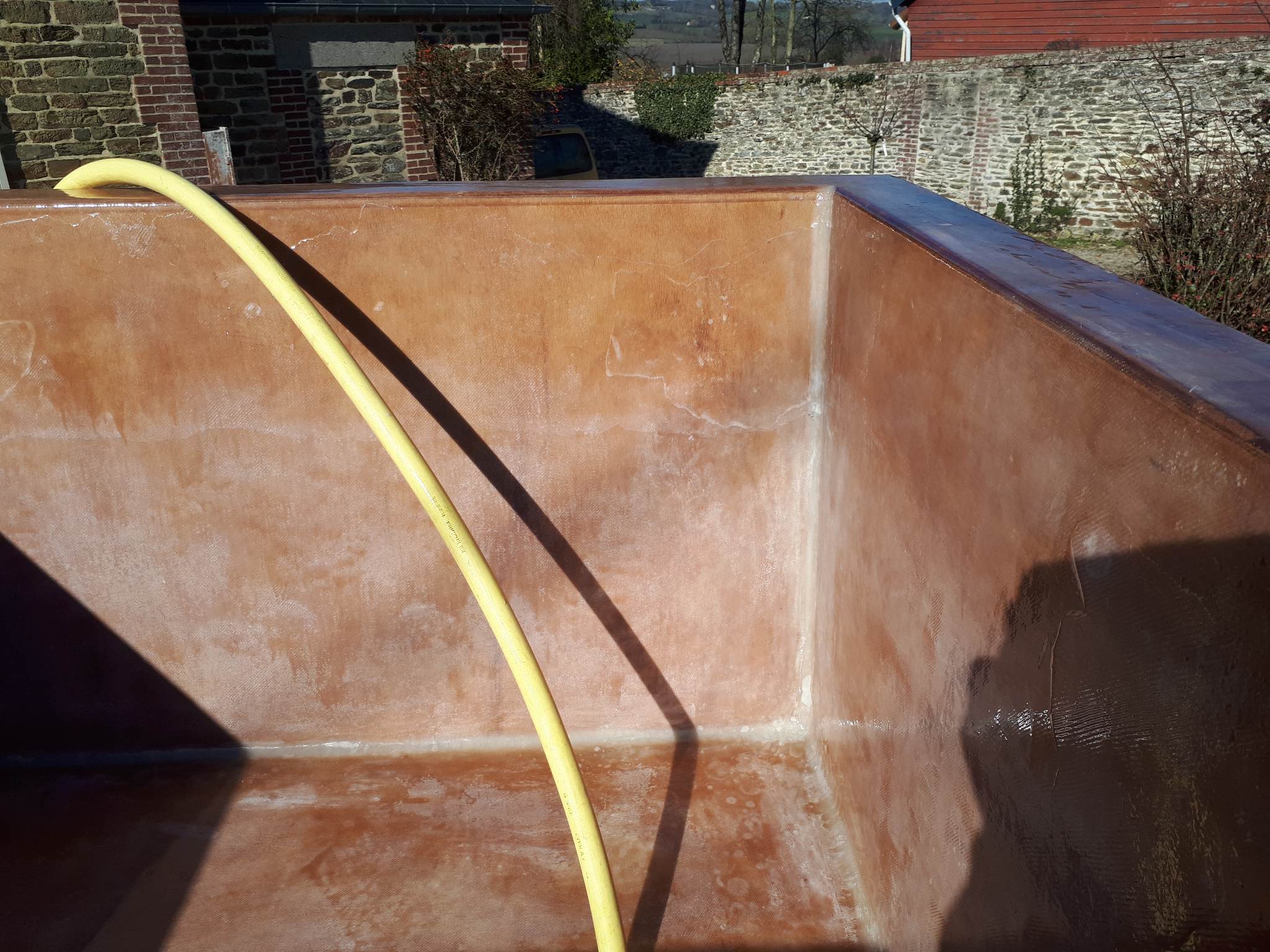 Il serait judicieux de coucher le bassin selon les parois que vous traitez pour être toujours à l'horizontale car j'ai remarqué des traces de coulure sur une photo. Les résines époxy ne sont pas thixotropes aussi ça dégouline ; pour les endroits où la fibre se sent au toucher, il est possible que la résine ait un peu glissé au moment de la stratification, l'usure a fait le reste.