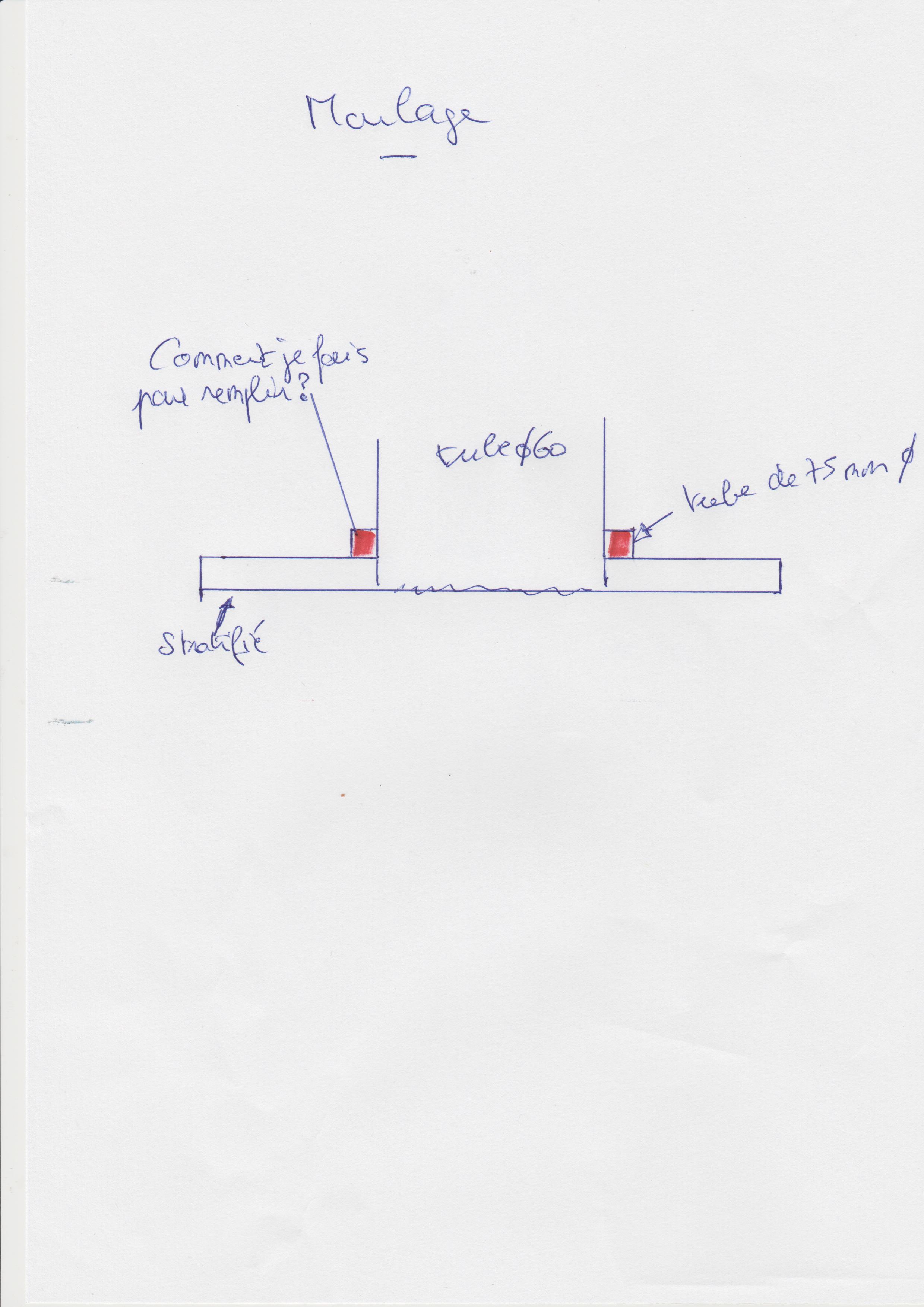 De même lorsque vous faites le moule de la plaque il faut veiller à ne pas faire un angle droit au niveau du renfoncement qui cachera le diamètre du trou sinon il y aura contre-dépouille et cela ne démoulera pas… et au moment de mouler la plaque finale, ne pas appliquer trop de gel-coat sur les bords de ce renfoncement.