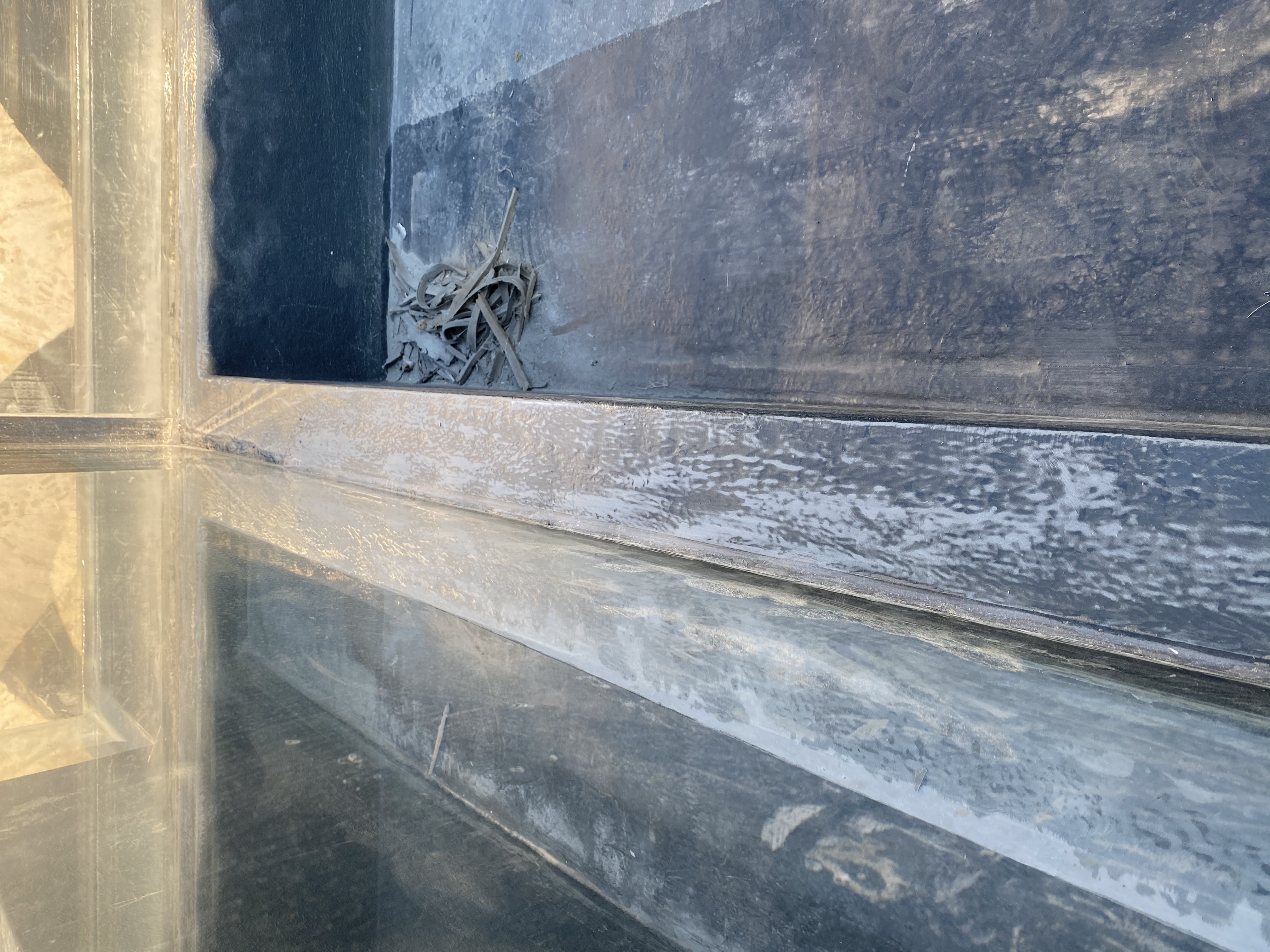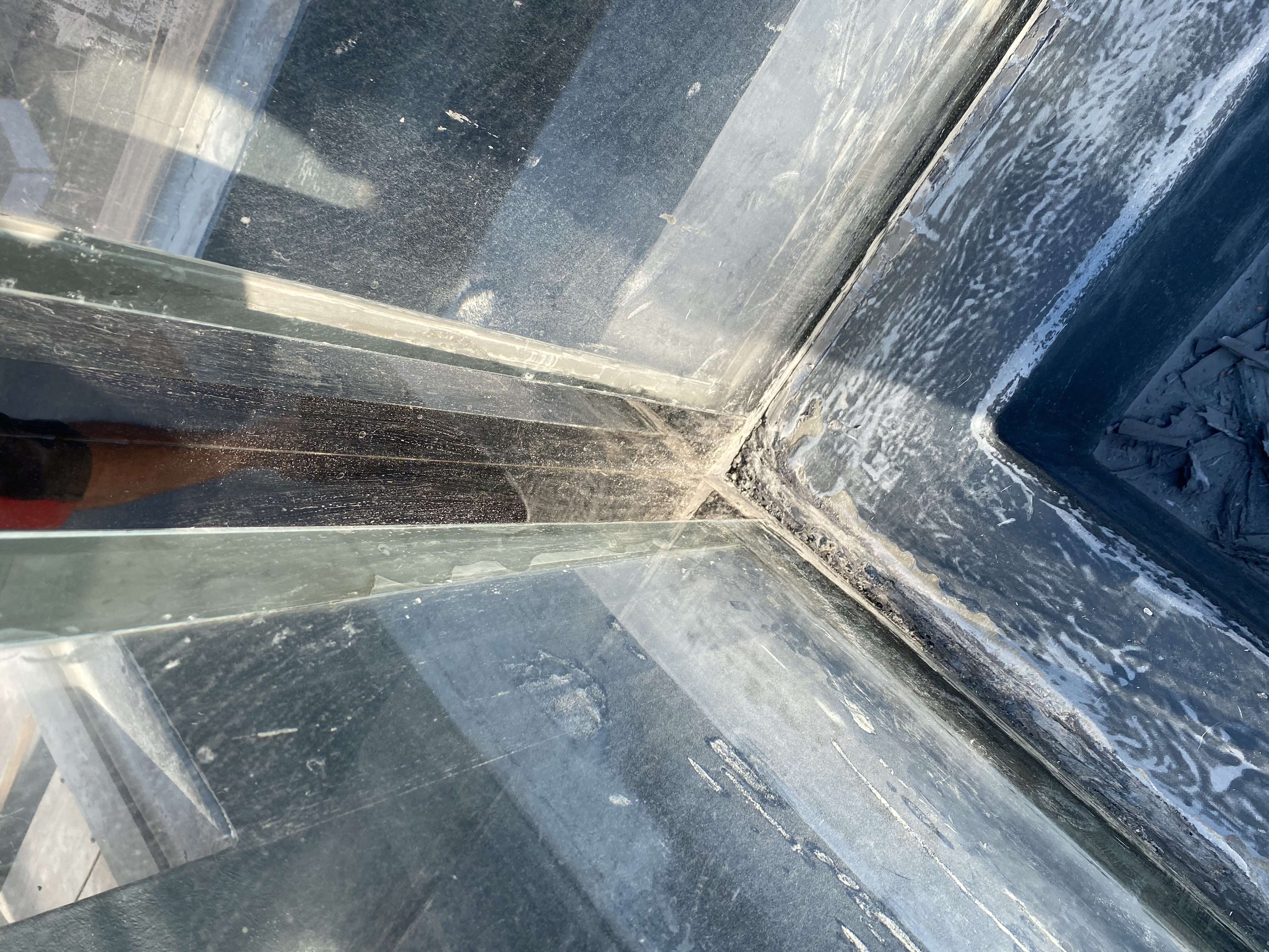 Les panneaux en L sont collés ensemble via une colle en acrylique liquide, et nous avons fait réaliser une pièce d’angle plus esthétique, une sorte de coiffe en info polimiroir, pour habiller le plus gros angle. Les panneaux en acrylique ont été posés sur un lit de Sicaflex (noir). Par dessus le Sicaflex, le poseur avait tiré une très légère couche de résine afin d’avoir une finition plane et encore dessus, du Mapesil en joint d’étanchéité.