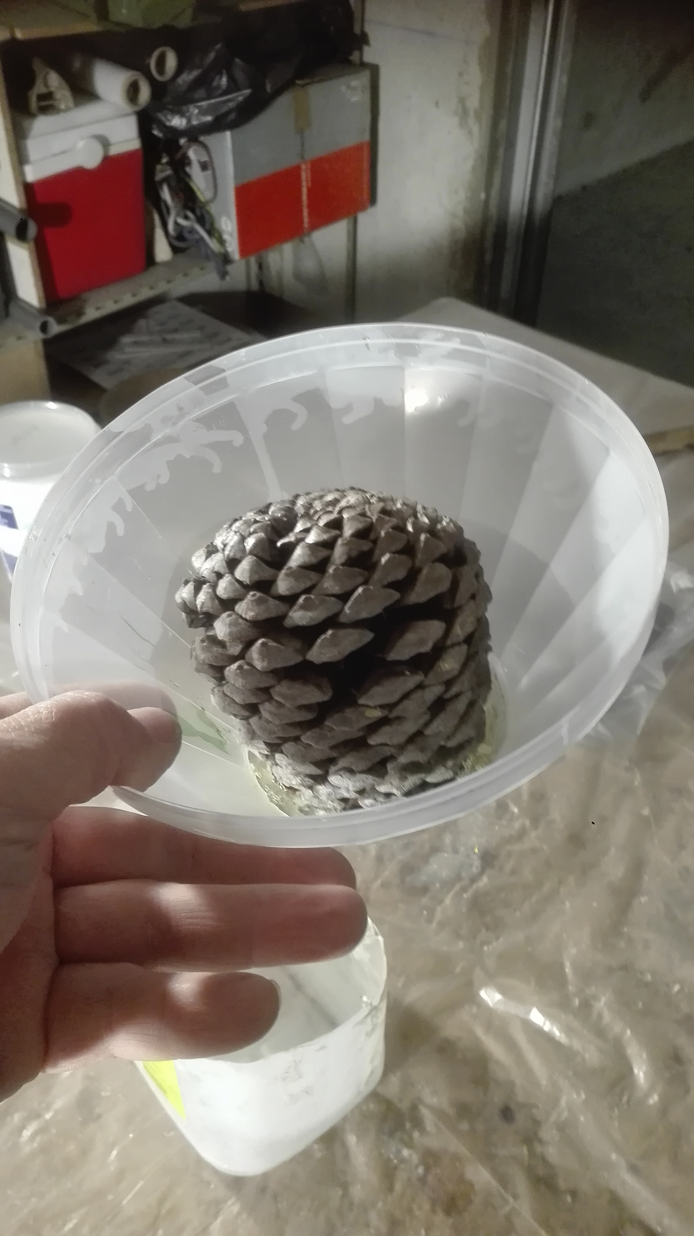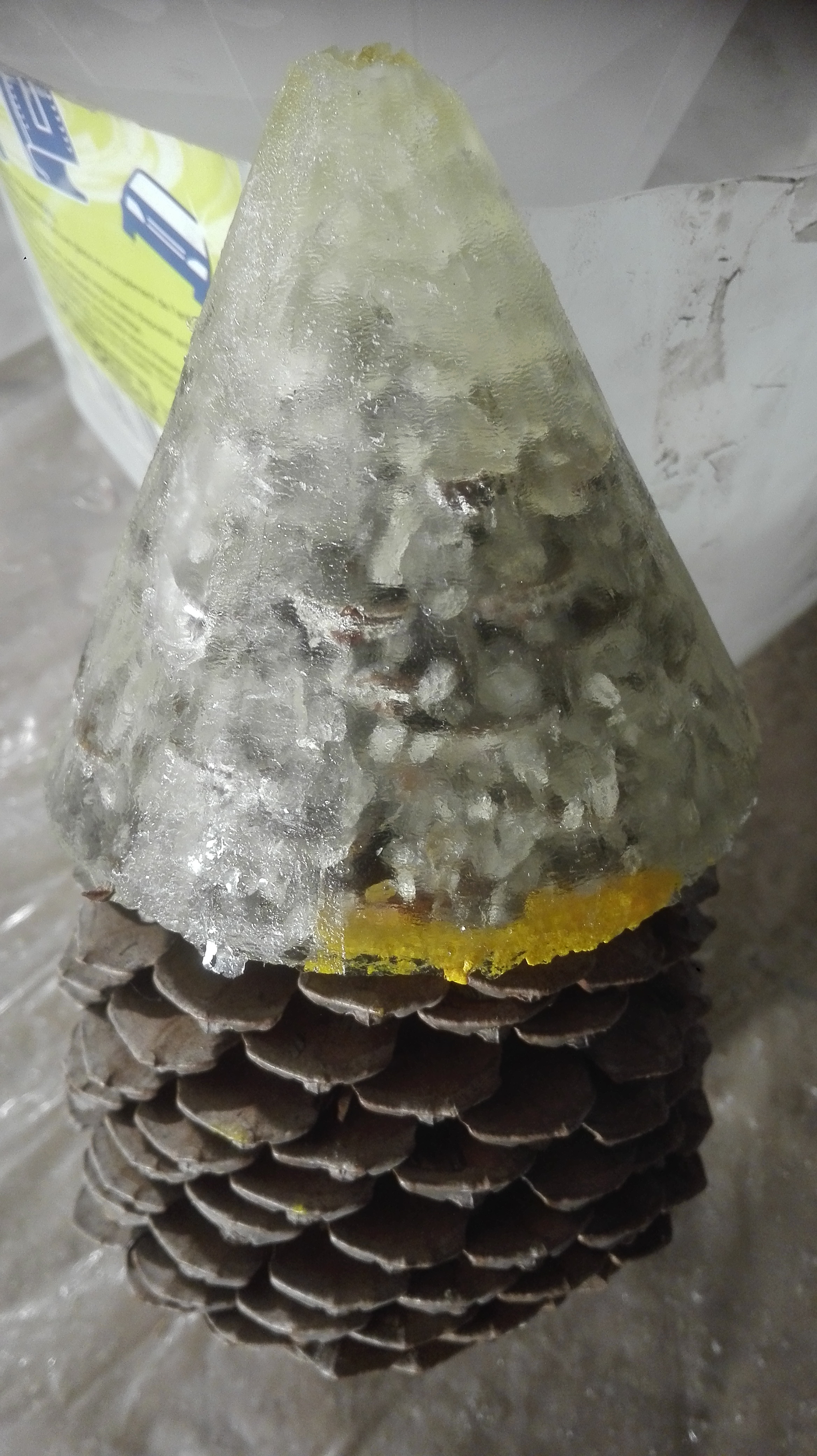 J' ai démoulé ma pomme de pin cet après midi et le bout ressemble plus à du latex très mou qu'à de la résine coulé depuis 4 jours. J' ai réussi à enlever le maximum de résine avec de l'acétone .