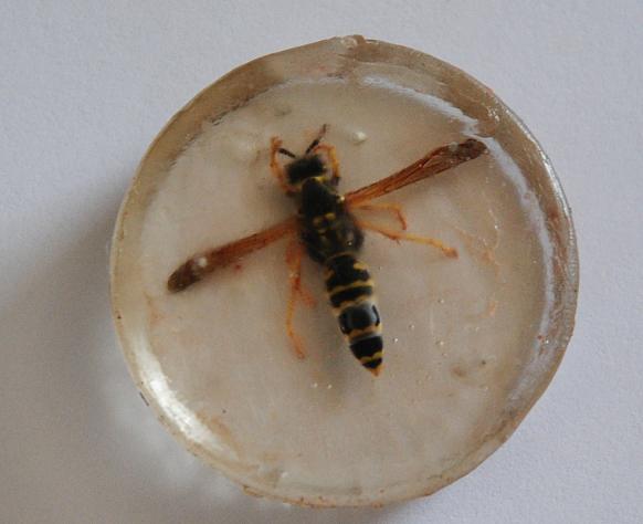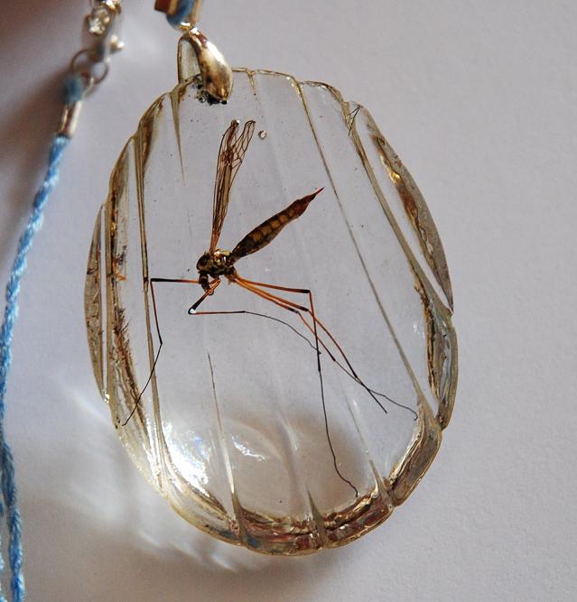 Je coule dans des moules en silicones de la résine dans laquelle j'inclus insecte, fleurs séchées ou coquillages.