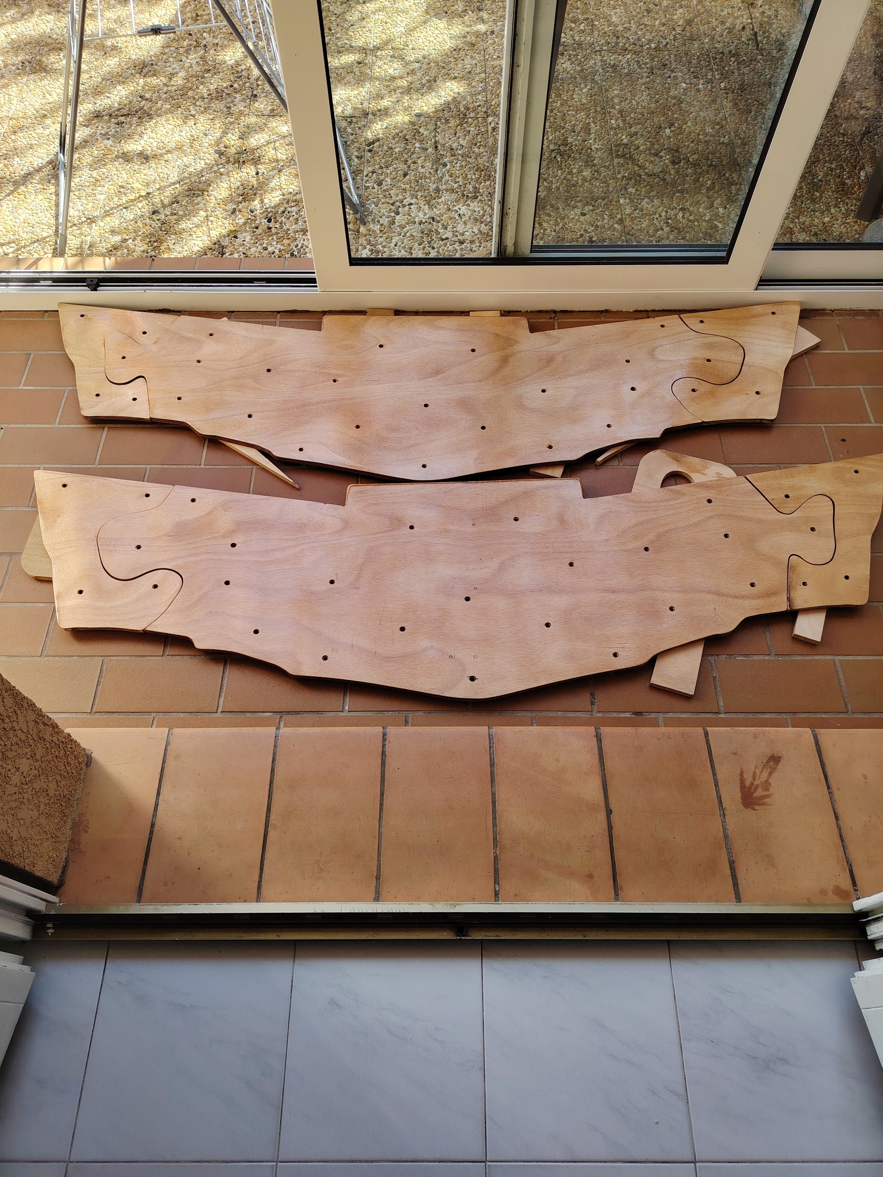 Je vous joint 1 photo de l avancement , les 2 CP qui seront coller entre eux par la suite sont imprégner de résine polyester ainsi que tous les champs , la face visible sur la photo n est pas encore ponçer , peut être ce soir si j' ai le temps . Avant collage entre eux , il y aura un mat de verre 300 gr sur toutes les faces du Cp , résiné et débullé , puis séchage ,et léger ponçage , dégraissage , pour l accroche avant d appliquer la colle polyester , tous les trous visible sur le CP serviront pour la mise en presse avec vis /écrous lors du collage des CP sur la peau exterieur du bateau . Je compte une fois le CP coller sur le bateau , chanfreiné tous les trous , boucher avec du mastic polyester chargé en fibre de verre , puis par la suite il y aura de la stratification par dessus (Mat/Roving/Mat) , côté extérieur du tableau et côté cale et top coat en finition . Photo à venir ....