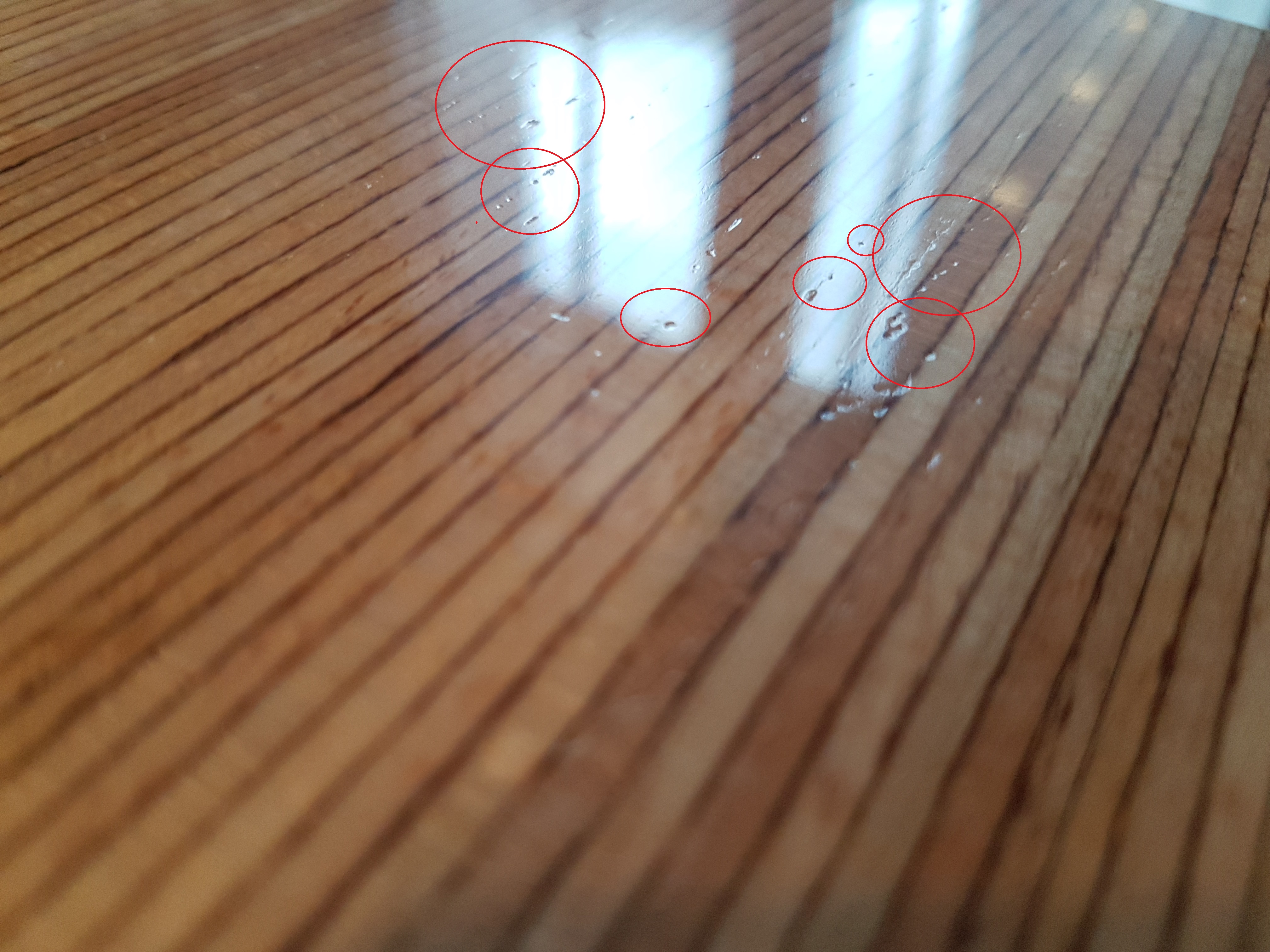 je me permet,au vu de tes soucis,pour bien faire,partout ou tu as se problème tu repasse une couche de verni,juste la ou c'est pas bon,bien sur petit ponçage,et nettoyage avant,une fois fait,tu poly a l'eau et tu lustre,j'ai déjà eu quelques déconvenue,mais j'ai persister.......