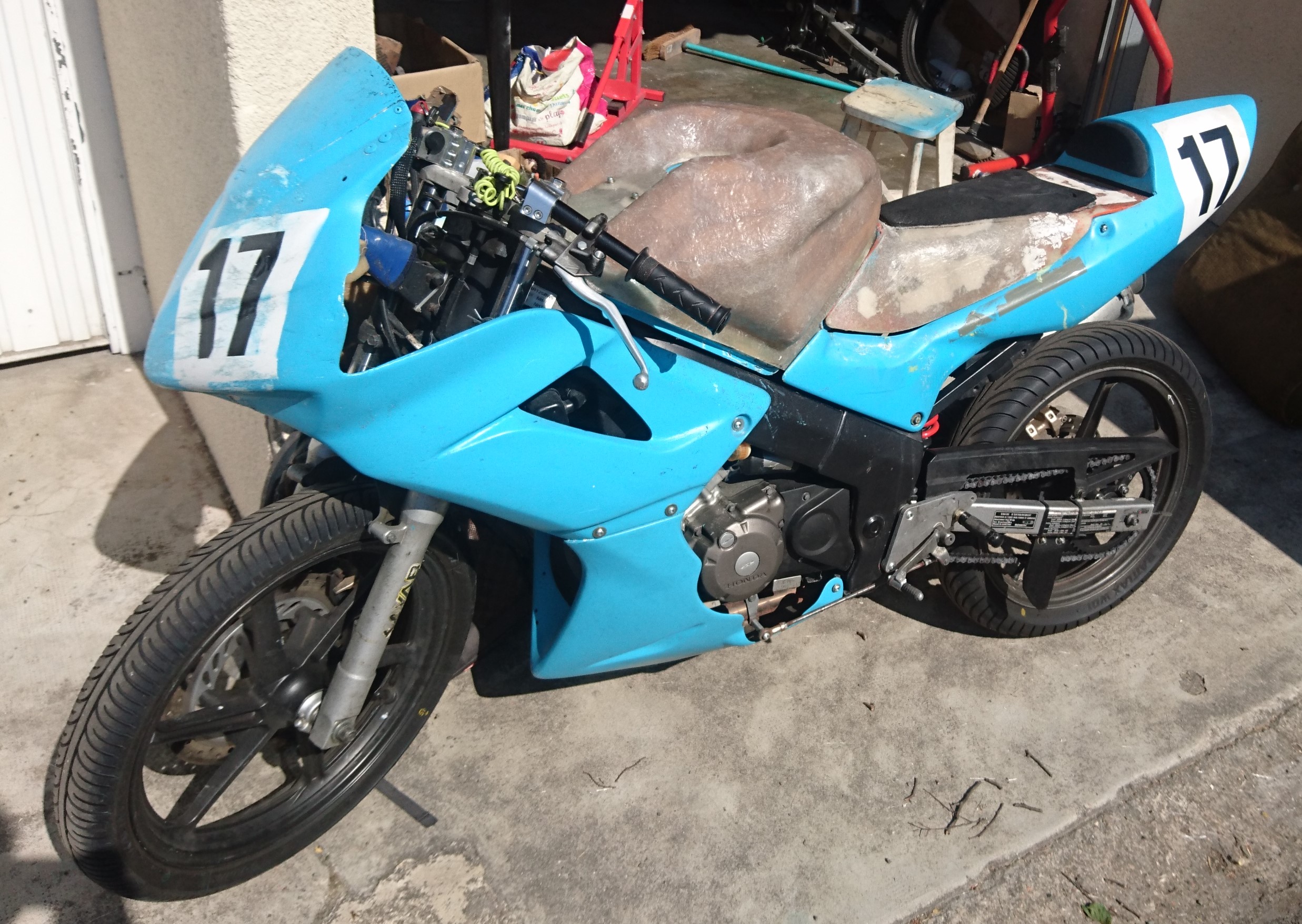 Sinon voila une photo : réservoir détouré, fixations faites, mais finition à faire! L'état de surface est évidemment tout pourri, mais c'était prévu au vu de la méthode...pas de surprises :lol: