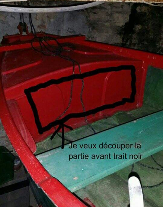 Je vous met des photos ci dessous,pouvez vous me dire si je peux decouper l avant de ma barque afin de pouvoir la refibrer et du coup de faire sous le tablier rouge un espace de rangement.