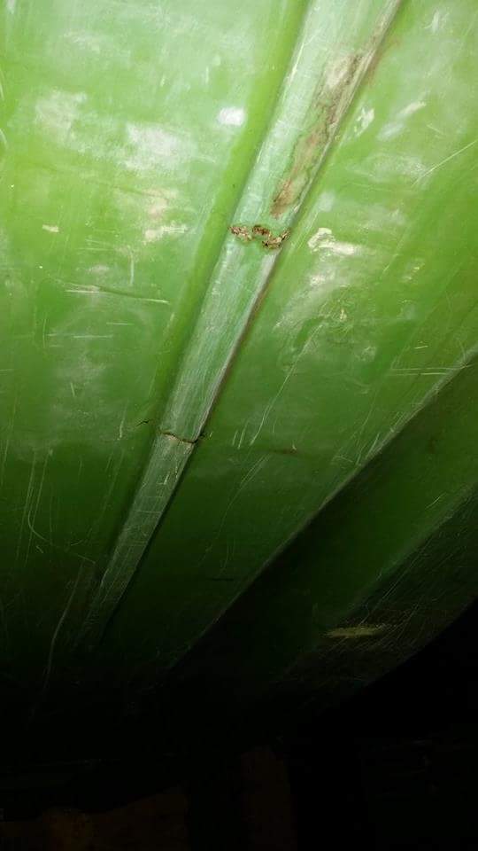 Partout où c'est fissuré, troué, abimé il faut poncer et réparer avec une stratification mat de verre-résine polyester isophtalique. Allez voir sur notre site Résines et Moulages les explications pour opérer des réparations, c'est par ICI.
