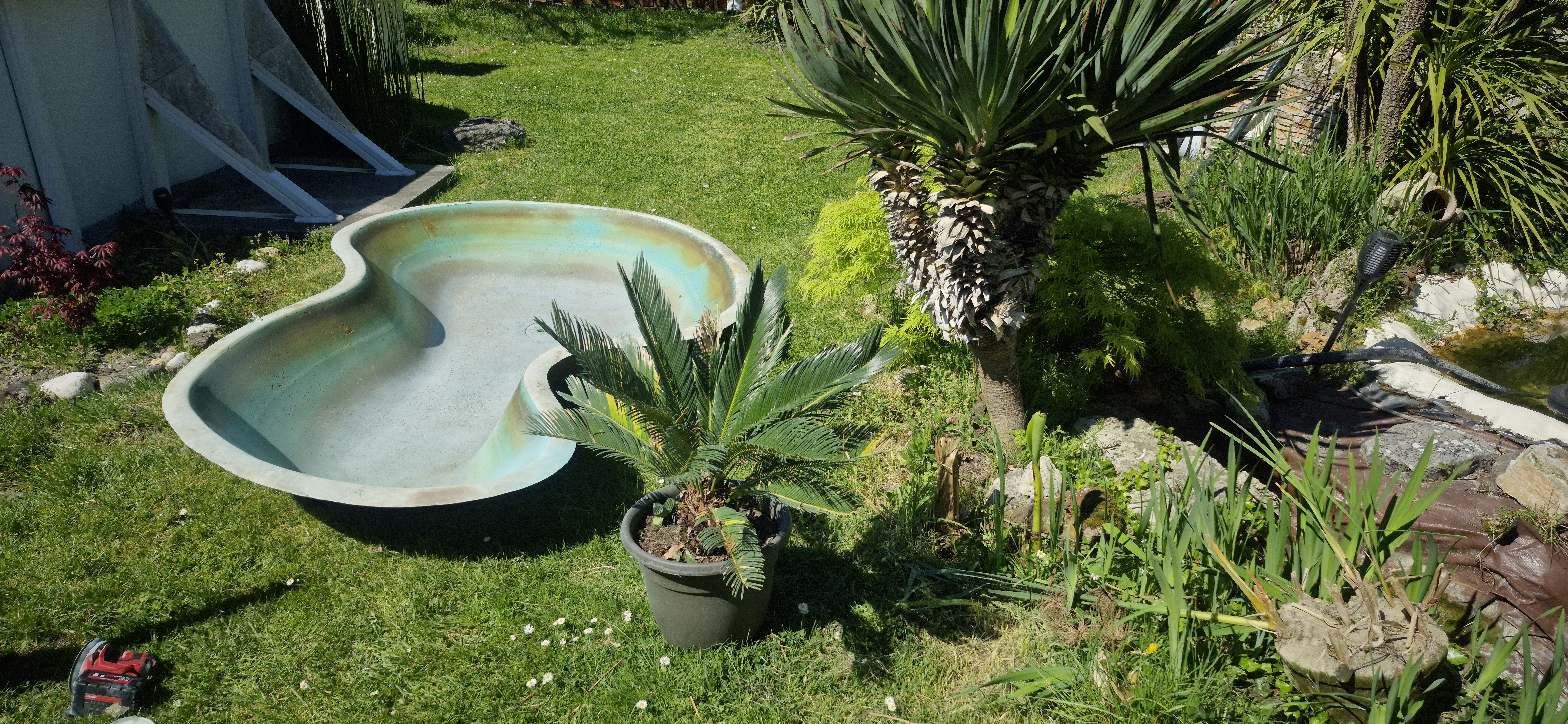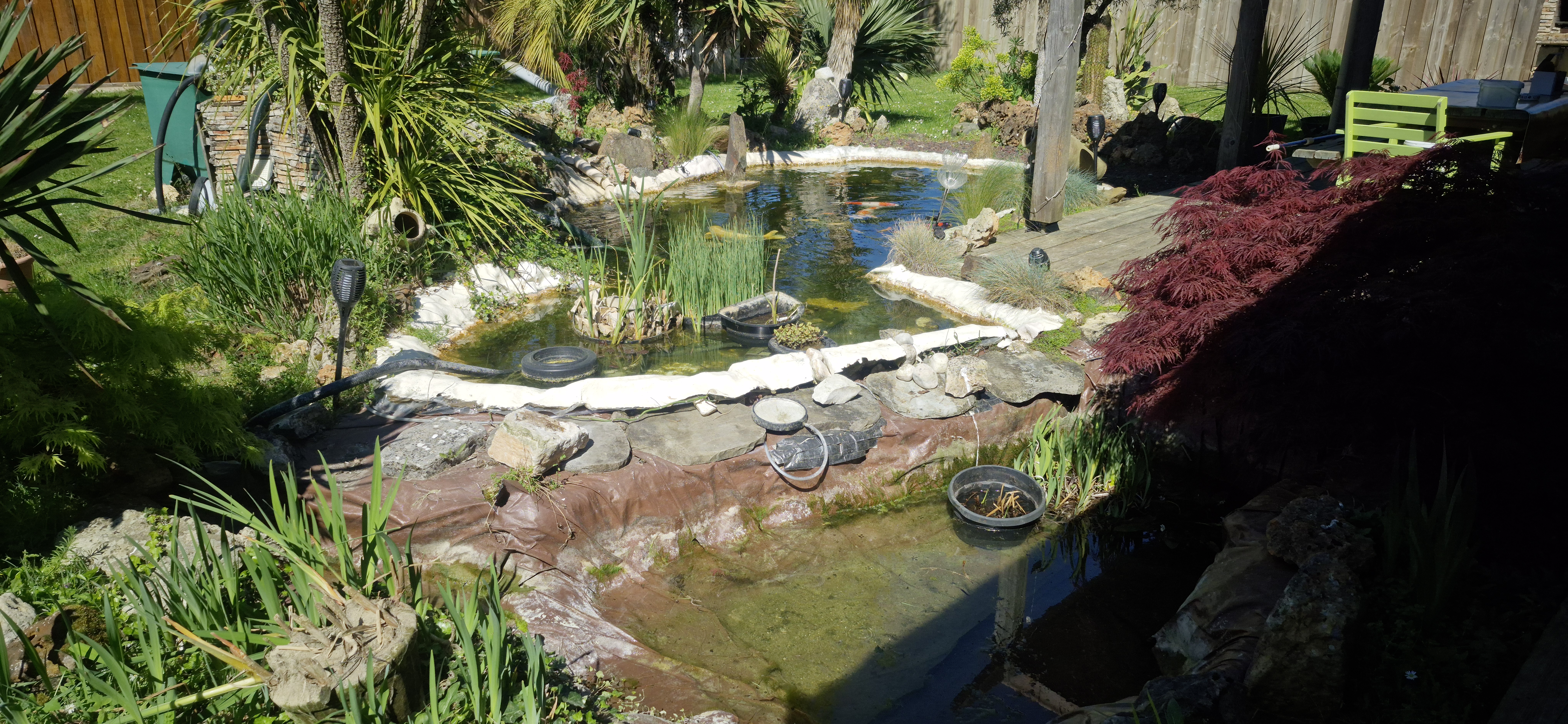 Je possède deja un bassin à koi de 7m3 que j'ai straté et topcoter y a 10 ans + à côté un 2eme bassin plus petit (2 m³) dont la bâche est cramée. (voir photos jointes).