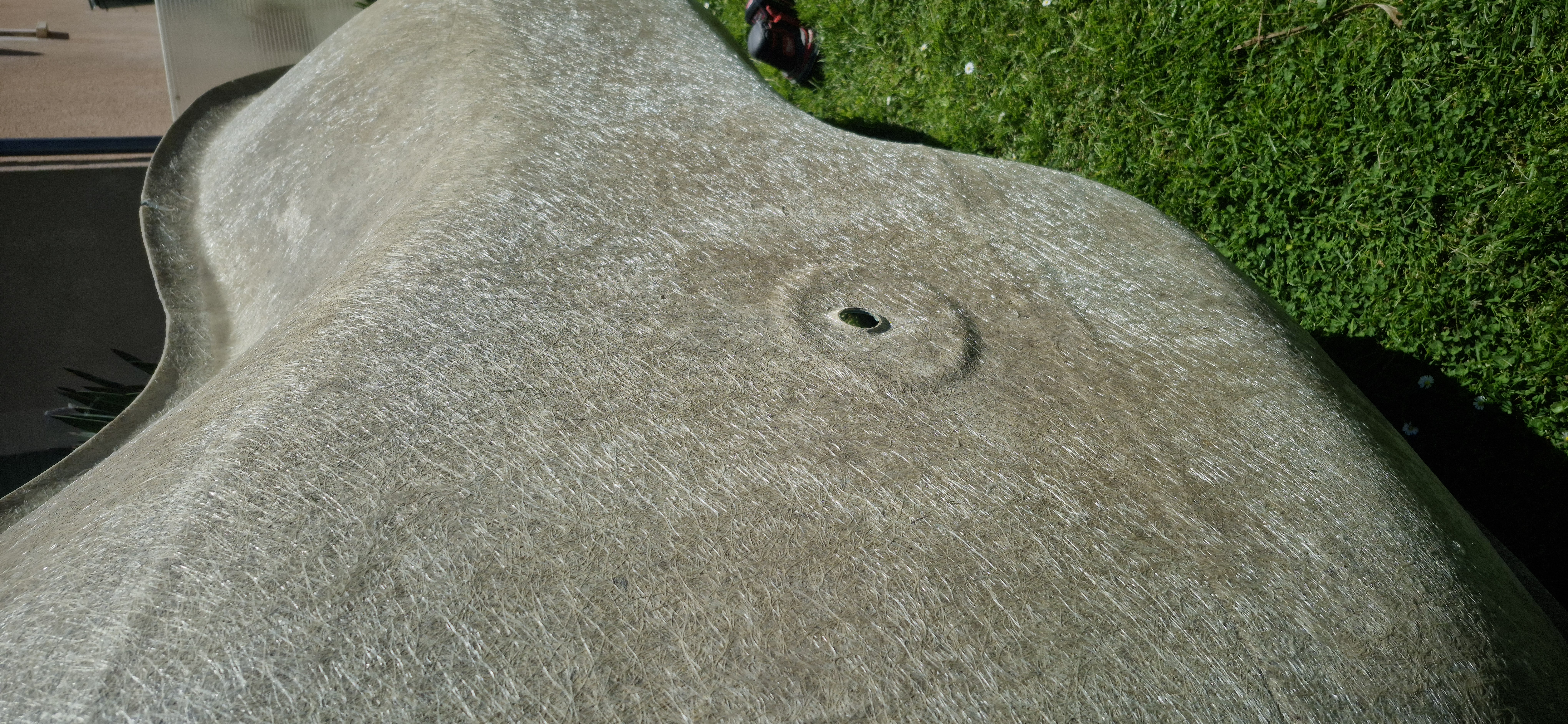 L'arrière du bassin est à traiter pour l'étanchéifier avant de le poser au contact de la terre ; les fibres sont bien trop apparentes et sans résine donc au plus simple ponçage léger pour raviver puis passage de top-coat à 450 gr/m2