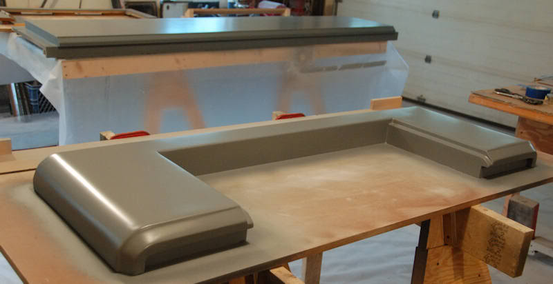 Pour faire le moule, cirage soigneux, gel-coat moule, résine à moule polyester et mat de verre 300 gr. De la fibre de cellulose pour les angles où il est difficile de faire épouser le mat. Avec cette résine il faut faire un moule de forte épaisseur et faire toutes les couches d'un seul coup.