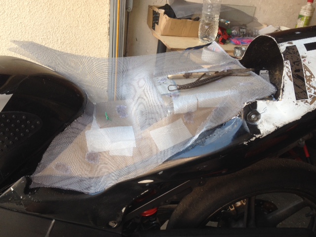 3/ comme c'était encore trop souple, et que c'est très compliqué de renforcer par en dessous (les renforts auraient buté contre le cadre et tout ce qui se trouve en dessous de mon mannequin), j'ai décidé de stratifier en place, sur la moto. Pour cela, j'ai scotché partout partout et ça donne ça :