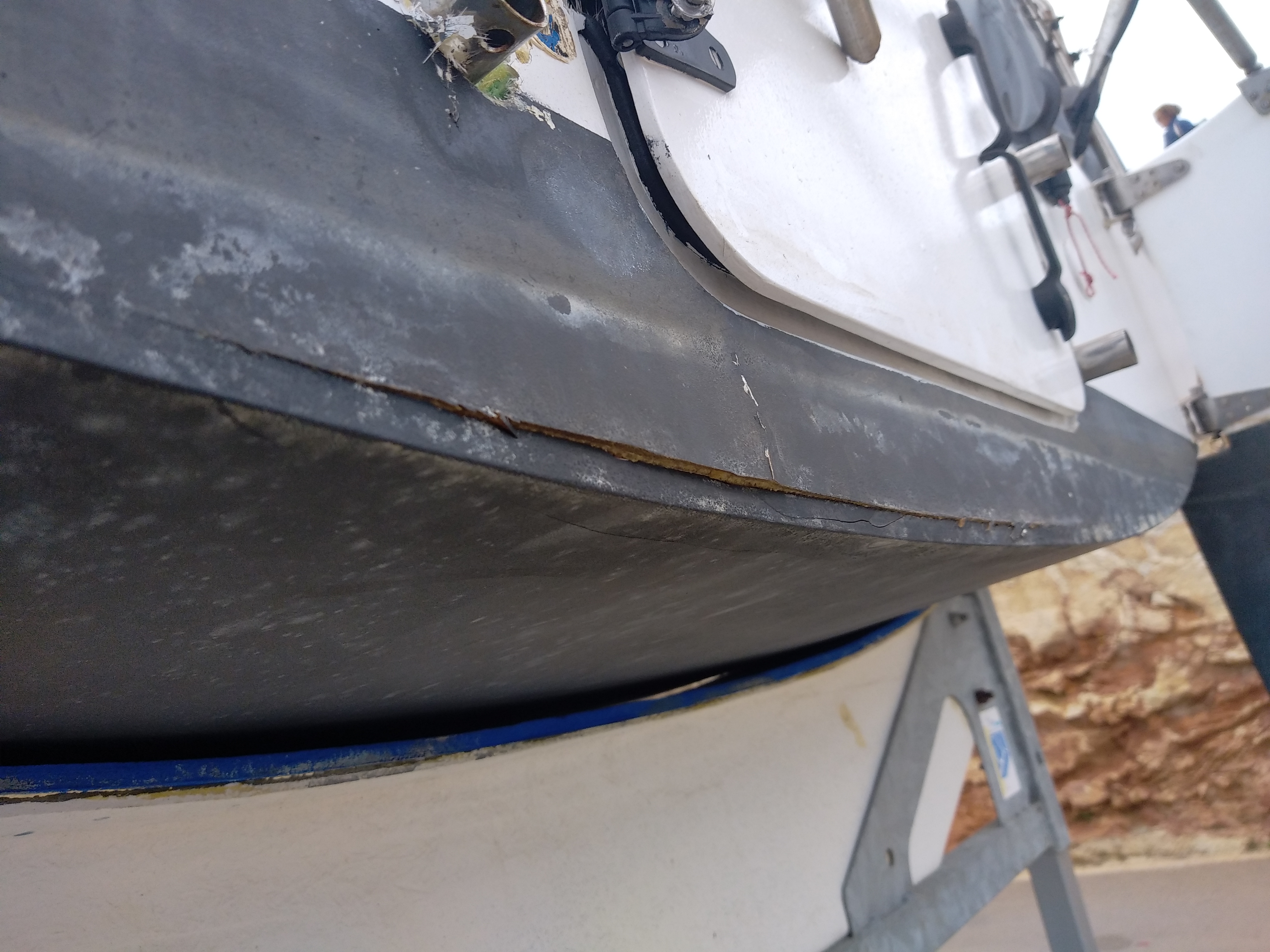 Apparemment le bateau a tapé sérieux à l'endroit de la fissure et donc le stratifié s'est dégradé plus loin que le dégât visible.