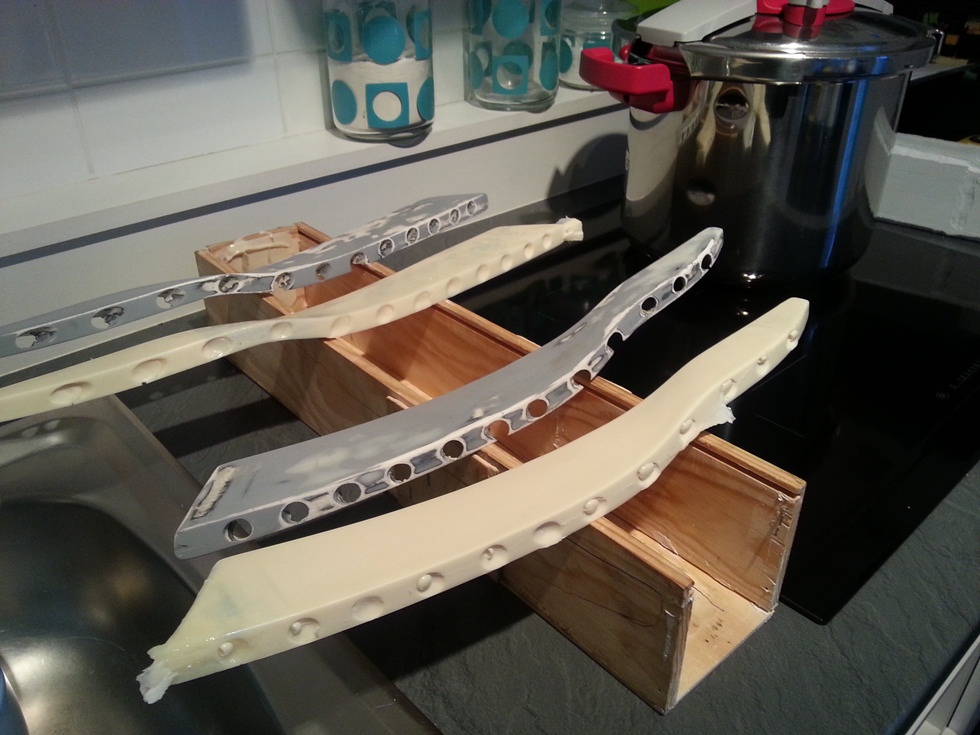 bref, j'ai fais quelques peu le sauvage car finalement j'ai coulé le moule en une seule fois. j'avais coulé cela dans une boite de bouteille de vin, en bois. A la fin, déclouage de cette boite, sortie du moule, etc ... J'avais donc un bloc de silicone (3kg y sont passés) qui emprisonnait mes originaux. J'ai donc tranché au cutter sur un coté (avec des tranches non régulières afin que les 2 parties s'accordent bien ensemble) pour pouvoir dégager mes pièces. les orifices des leds ont bouchées (comme Isiatis l'avait souligné) en laissant apparaître la cuvette pour faciliter le perçage. J'ai également creusé au cutter 2 puits (pas besoin d'event car forme assez longue et moule mis à la verticale