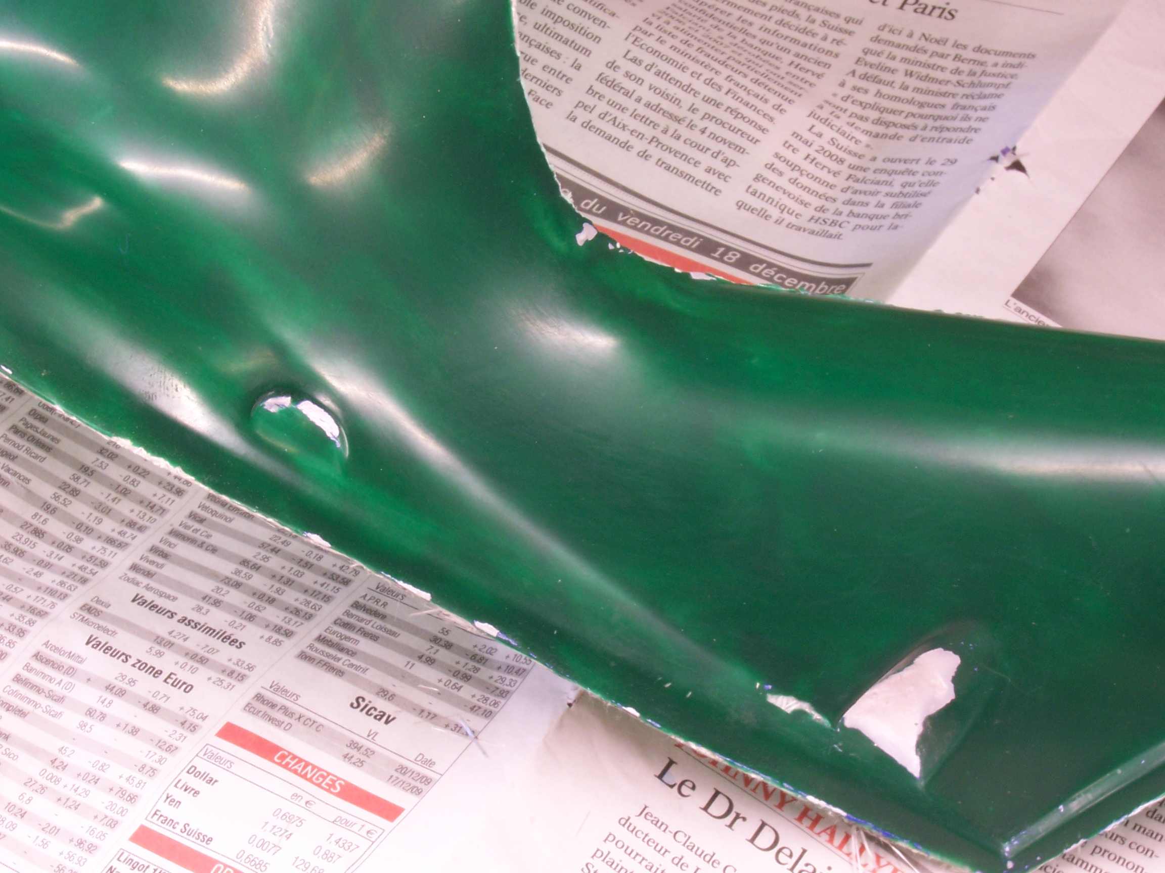 Pour le peu de dégats sur le moule, vous ne touchez que les endroits abimés et vous refaites la forme au facility, inutile que reprendre avec du novaprêt partout. La partie arrachée est-elle très épaisse ? Auquel cas, il faudrait peut-être bourrer avec un mélange fibre-résine pour faire choucroute (qui se ponce très mal !) puis facility.
