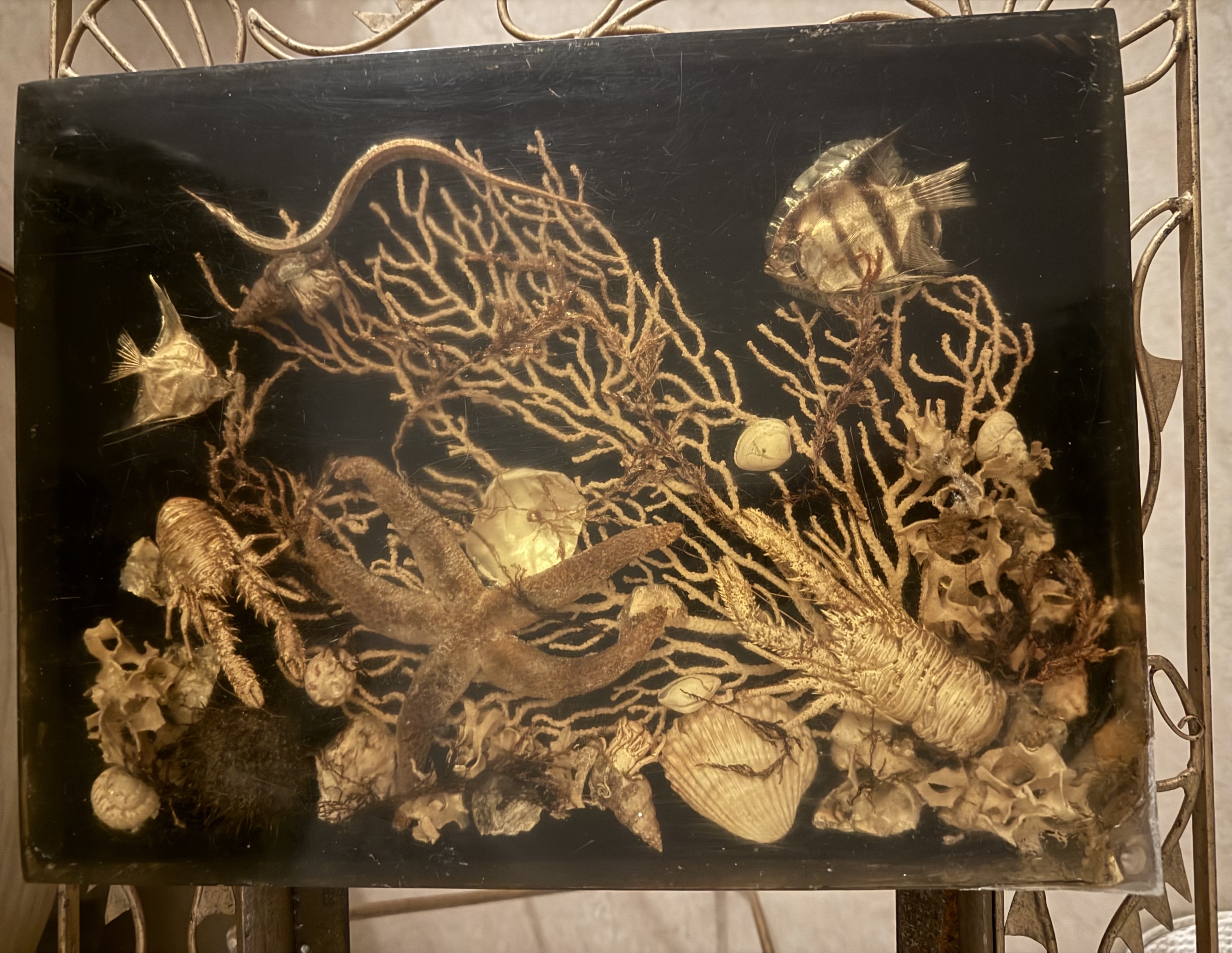 Je souhaite rénover cette résine avec inclusion vintage (format 30 x 45 x 5 cm). Je recherche des conseils, s'il vous plait.
