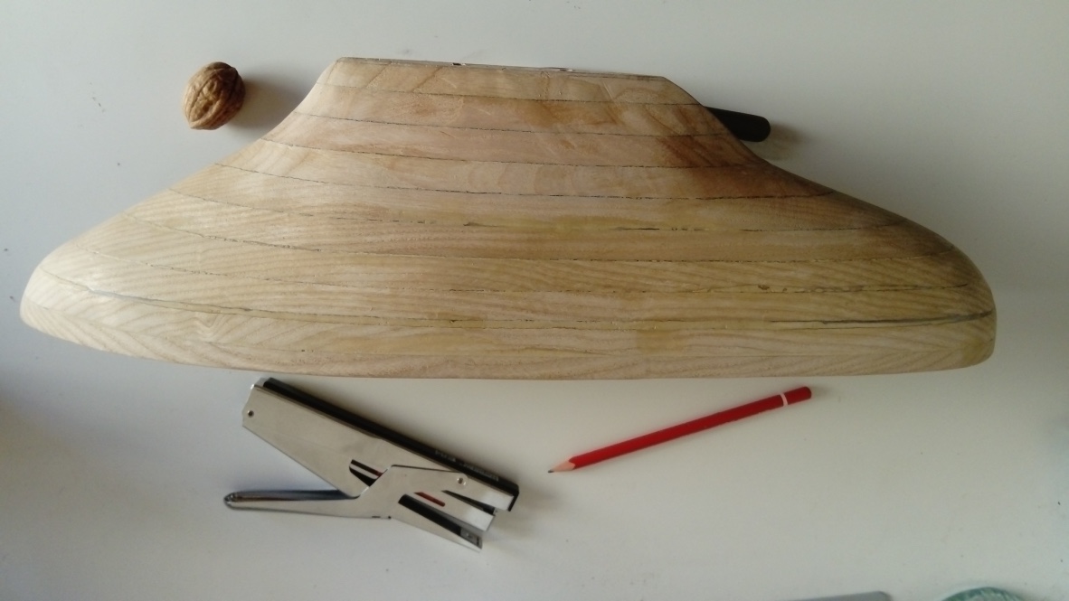 2°: Au vu du profil de mon modèle, qui n'est pas inspiré par une pratique de la mer ou de la rivière, mais plutôt d'une inspiration assez livresque qui fait de l'élément marin un principe d'aventure sur un monde où la forme du bateau indique aussi pour l'eau la manière dont on aimerait qu'elle nous porte, on verra sans doute qu' à moins qu'Ulysse lui-même n'entreprenne le voyage, il n'est pas dit que tout cela flotte exactement d'après les lois du milieu qui ne concède peut-être pas si vite à quiconque le droit de flotter comme il l'a décidé. Enfin, tout de même, cela a bien l'air d'un bateau et puis ma résolution est prise, il flottera. Donc, voici maintenant ma question pour le moule: Etant donné que le galbe se réduit subtilement et non brusquement vers la quille, j'imagine la difficulté que je pourrais rencontrer de devoir appliquer le Mat 300 jusqu'au fond, et je vous demande si d'après vous c'est une difficulté facilement franchissable après quelques conseils, ou bien s'il vaut mieux imaginer un moule en deux parties, sachant que comme le cerveau droit et comme le cerveau gauche, elles se ressemblent beaucoup sans être exactement identiques. Je vais vous envoyer deux ou trois photos. Les dimensions ne sont pas vastes: Plus ou moins 45 cm en longueur, 13 en largeur, 20 en profondeur.