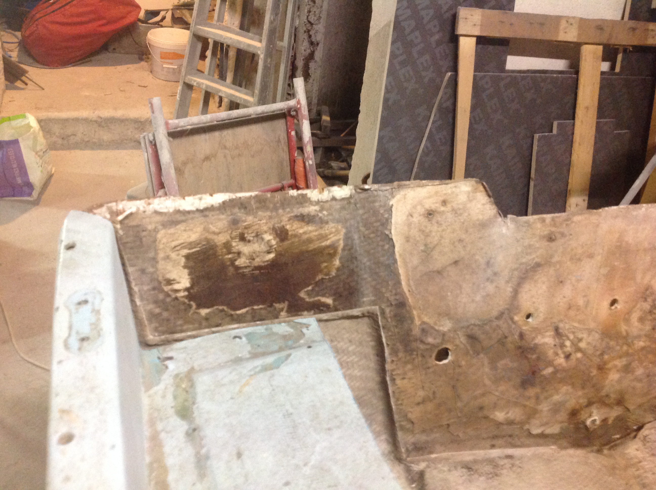 Bonjour donc j ai découpé le tableau arrière le cp était collé avec de la colle ou mastic blanc très dur et il y avais 2 morceaux de cuivre pris dans le bois et qui sortaient a l extérieur ensuite il y a deux morceaux de cp en haut qui continue jusqu'au bord de la coque ce bateau n a pas fini de m étonné