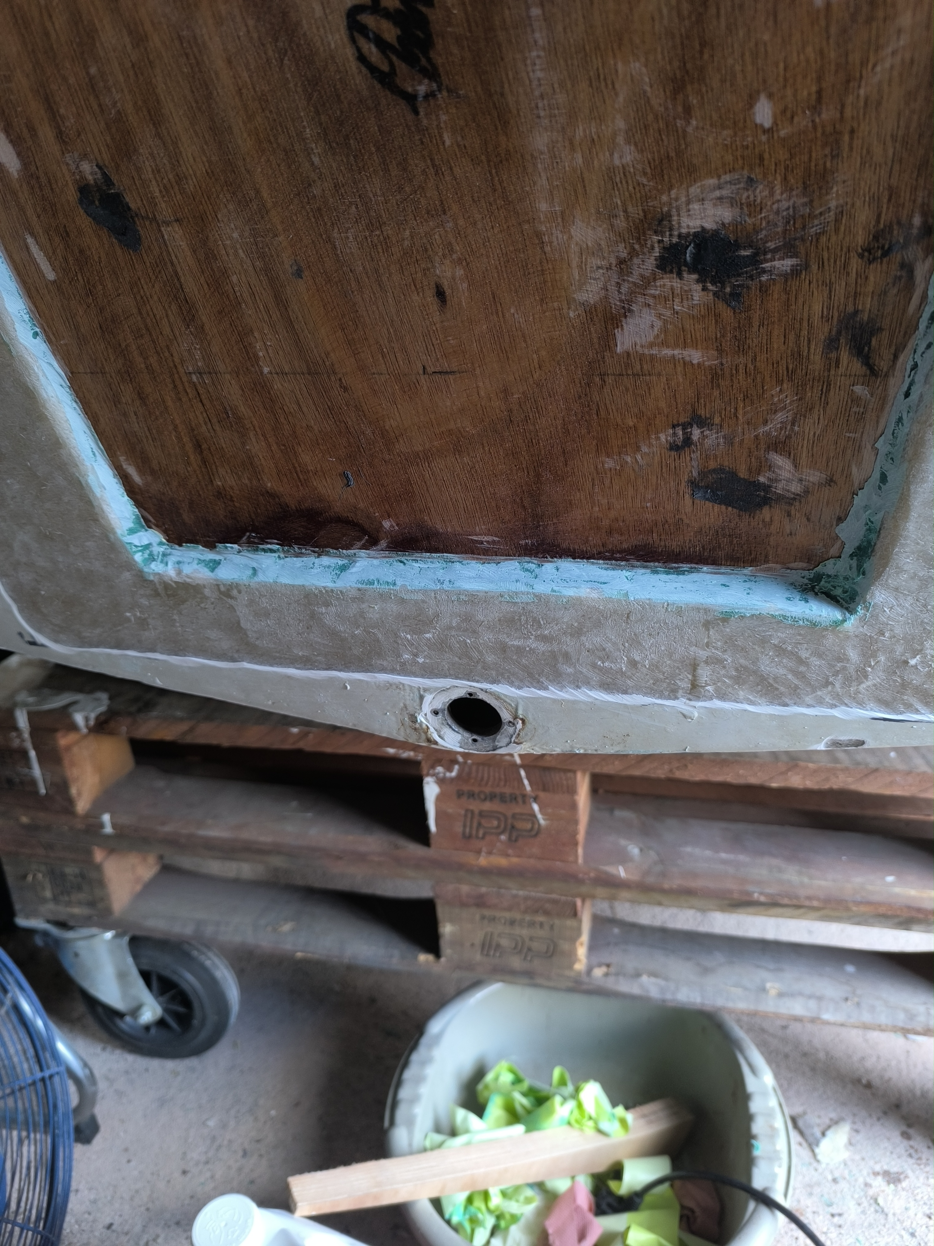 Une question je dois stratifié le tableau arrière qui va supporter un 30cv pas plus , comme l'autre mat roving mat mais là le bois effleure en haut la fibre mis a nu mais en bas il y a au moins 6mm ,7mm a rattraper, j'ai mis du mastic fibré pour un joint en pente douce pour debuller facilement mais mon idée est de rajouter une épaisseur de 450 au gabarit du bois pour rattraper la différence ; interposé entre la pose du mat et du roving qui iront s'accrocher elles sur la fibre mis à nu que d'ailleurs que je vais agrandir car là il n'y a que 10 cms (photos)