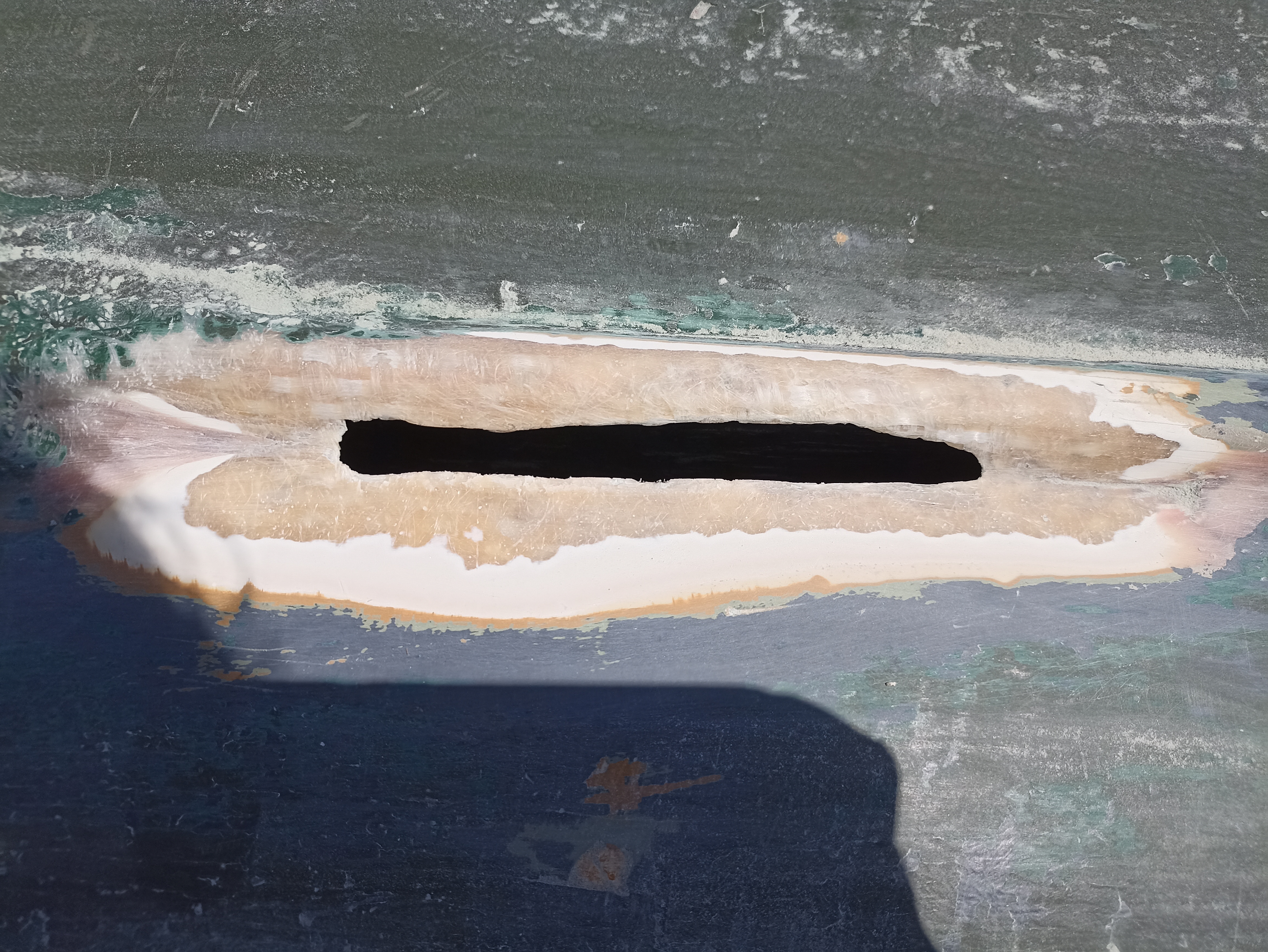 Sur photo on peut toujours se tromper mais du stratifié sain il y en a autour du trou ; si la fibre de verre n'est pas blanchâtre comme s'il y avait des vermicelles dans le potage, c'est tout bon.