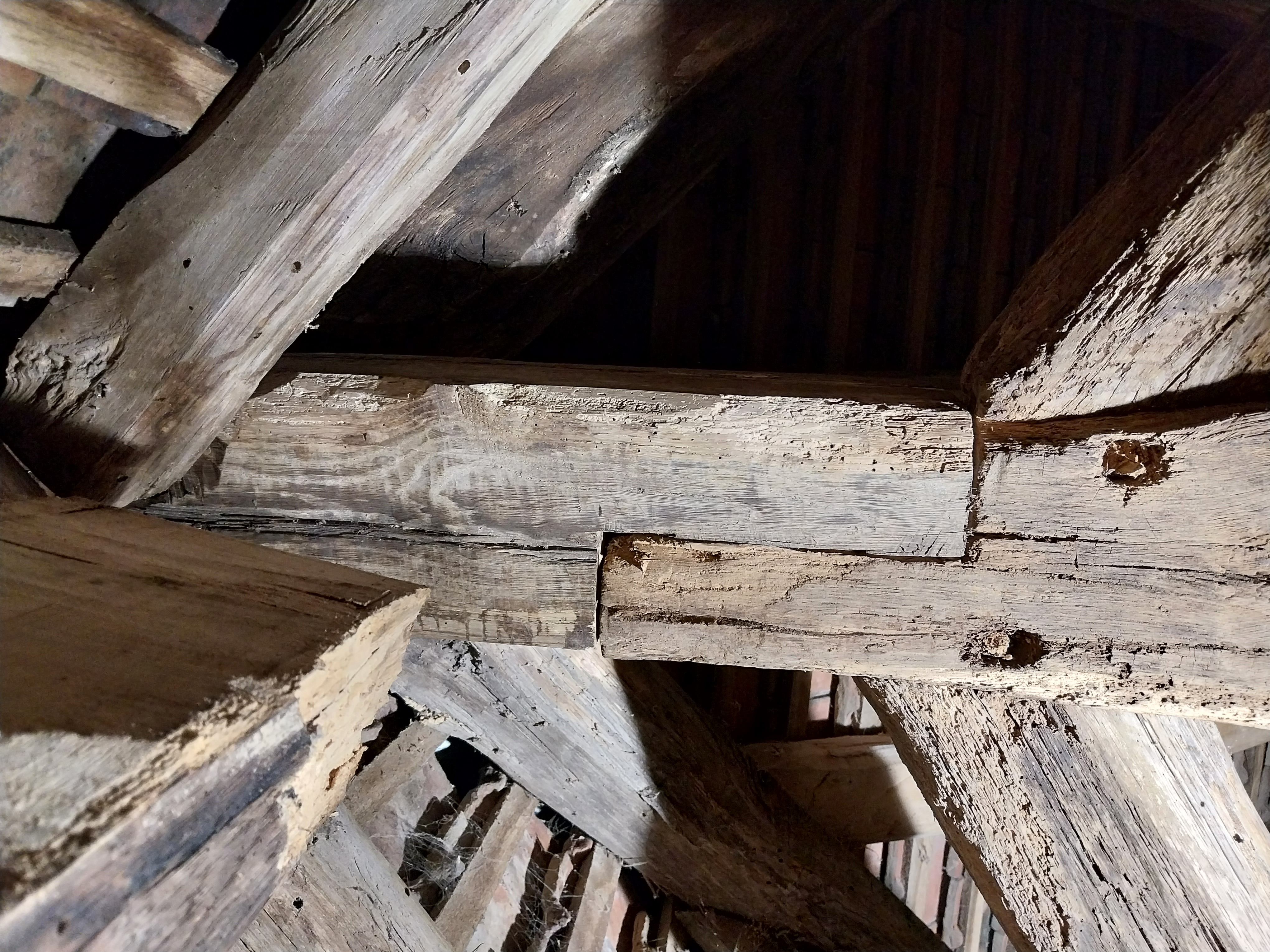 J'avais déjà planché sur le fait de couper ces pièces de charpente et de les remplacer. Mais l’accès est difficile, très étroit et l'utilisation d'outils en vu de faire des coupes précises dans du chêne sec depuis près de 250 ans pour recevoir des assemblages à mi bois mes parait très aléatoire. Et une fois que c'est coupé je ne peux plus revenir en arrière... C'est une décision à ne pas prendre à la légere.