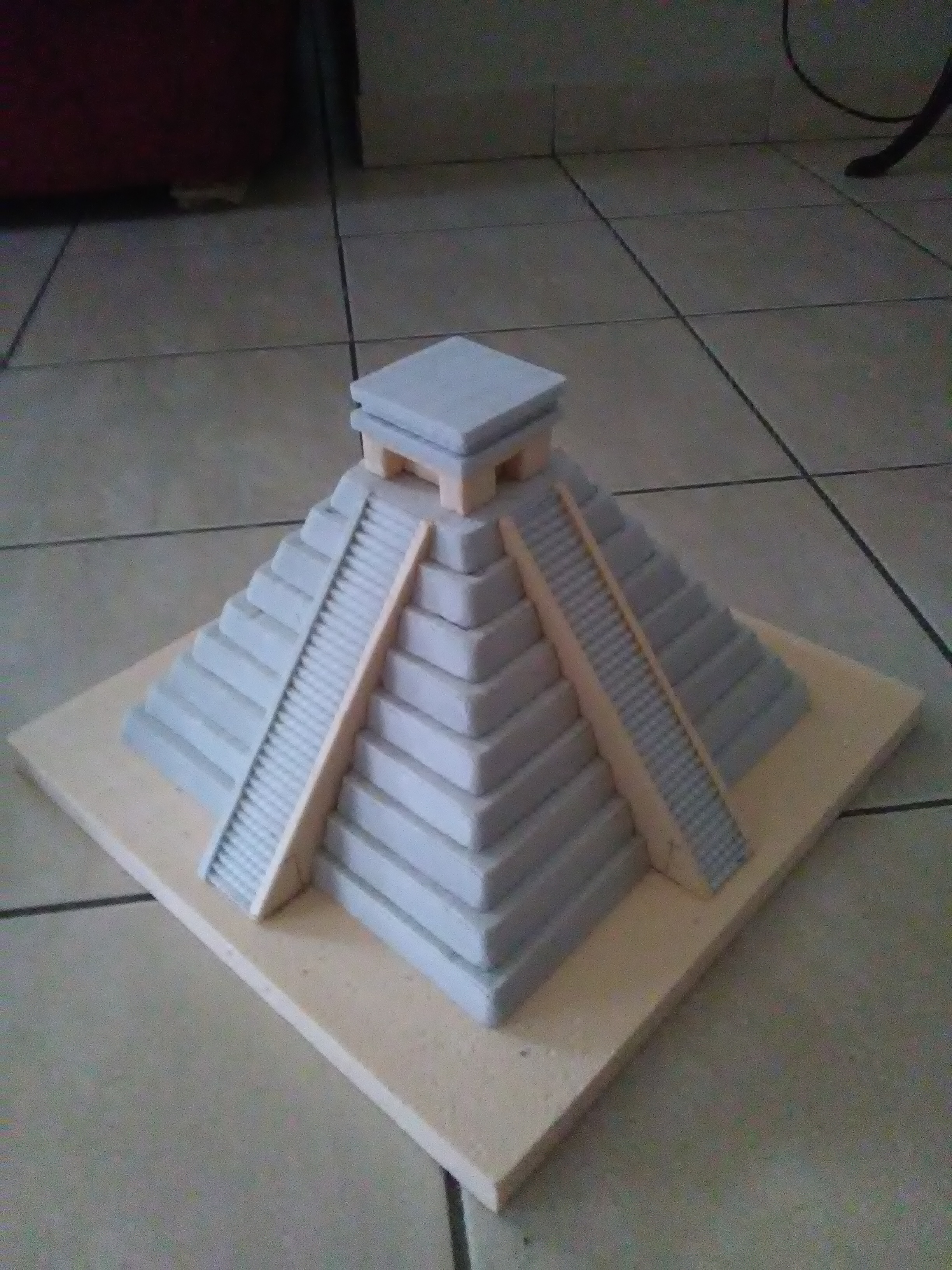 Re bonjour, comme promis je vous montre mes fameuses pyramides aztèques en polystyrène extrudé, que j'ai construite en collant plusieurs pièces sculptés (colle a bois).