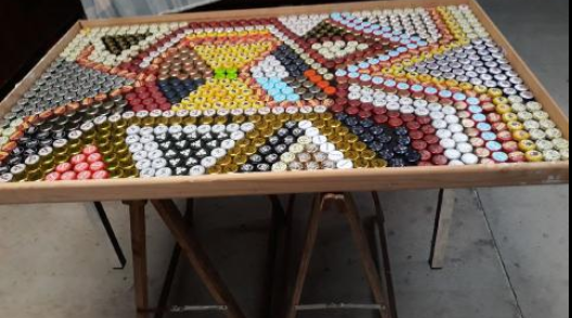 Je souhaiterai réalisé la couverture d'une table avec des centaines de capsules de bières. Pour ce faire, j'ai déjà entrepris l’installation d'un cadre tout atour de la table avec des moulures. Celui-ci permettra de pouvoir couler la résine et la contenir.. Par la suite j'aimerai décorer celui-ci avec des dessous de verre cartonnés. Voici un petit aperçu de la table pour le moment, à noter que les capsules ne sont pas collées mais simplement positionnées pour le moment