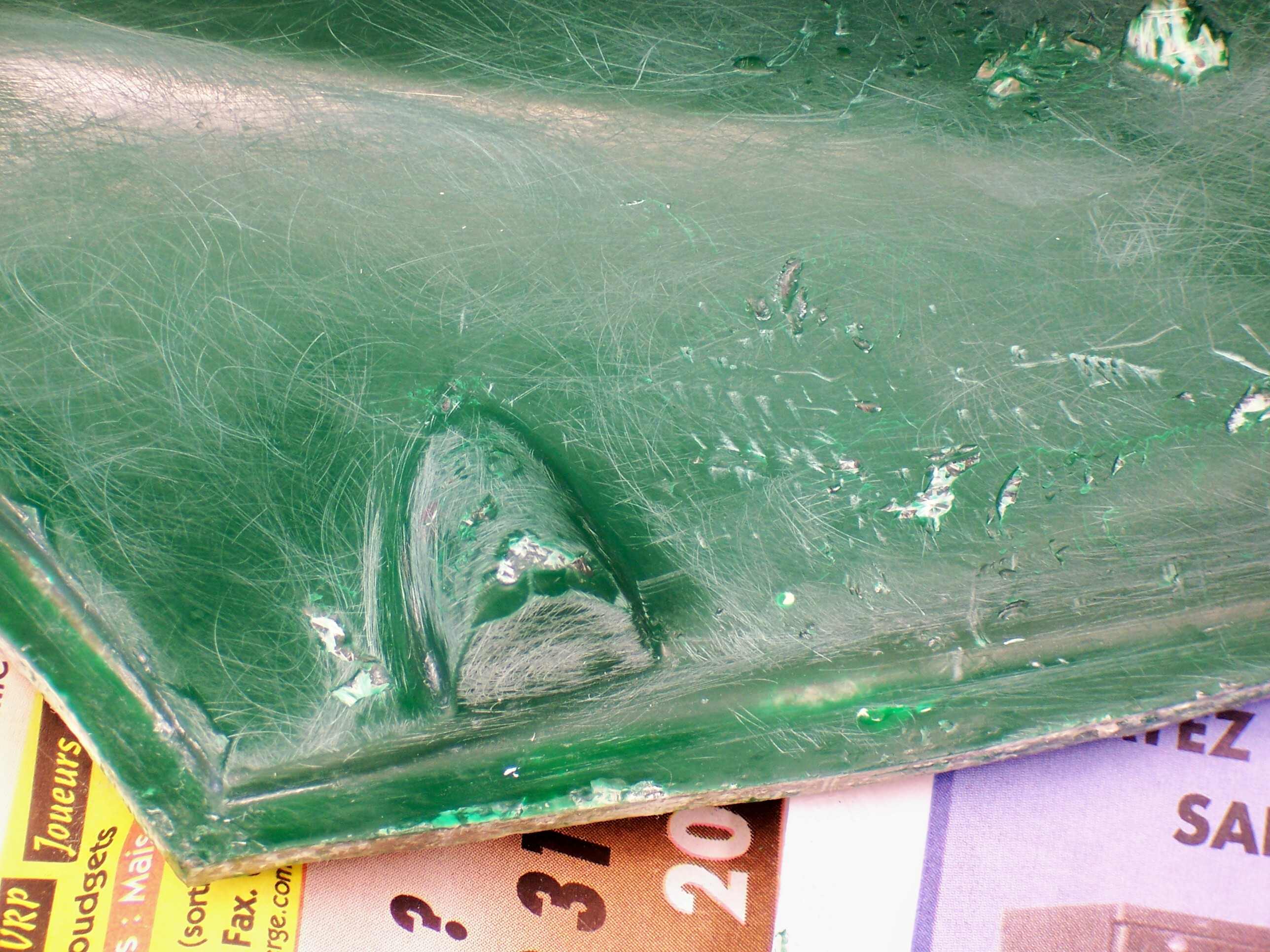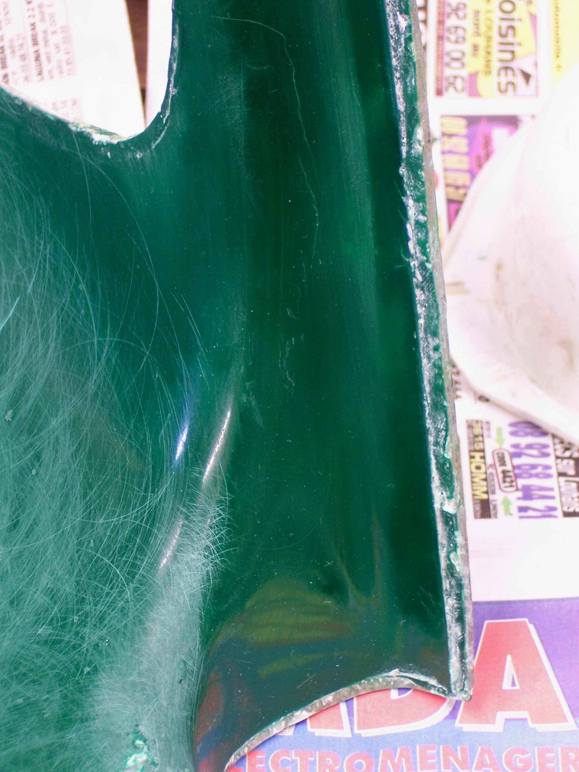 J'ai donc commencer par racler les croutes de gel-coat et de fibre qui ont bien voulu se décoller à l'aide d'un petit ciseau à bois: