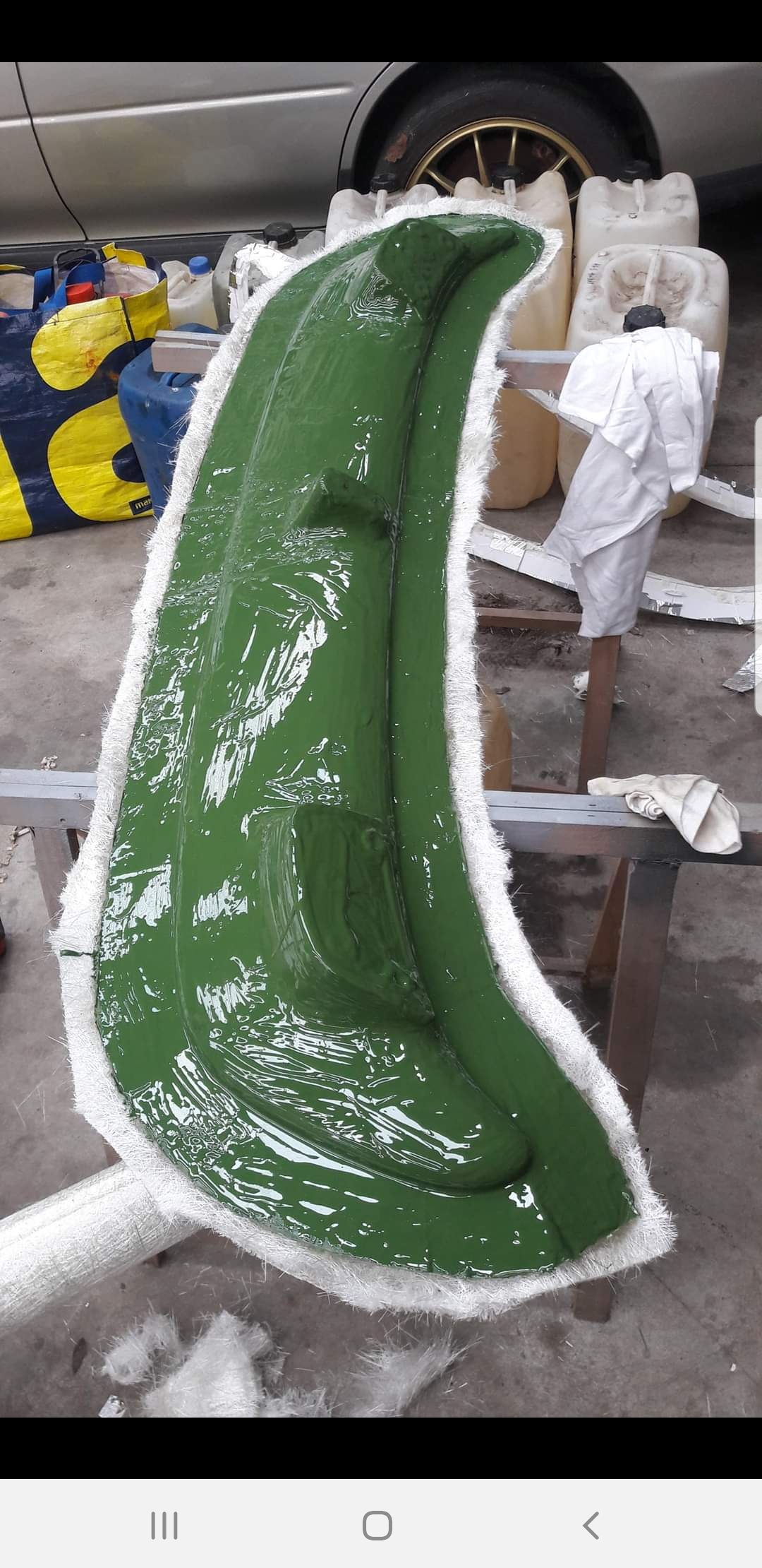 Collage des deux demi-ailerons puis stratification extérieure tout simplement. Ensuite ponçage-mastic-ponçage-peinture PU bi-composant si vous voulez que ça tienne un moment.