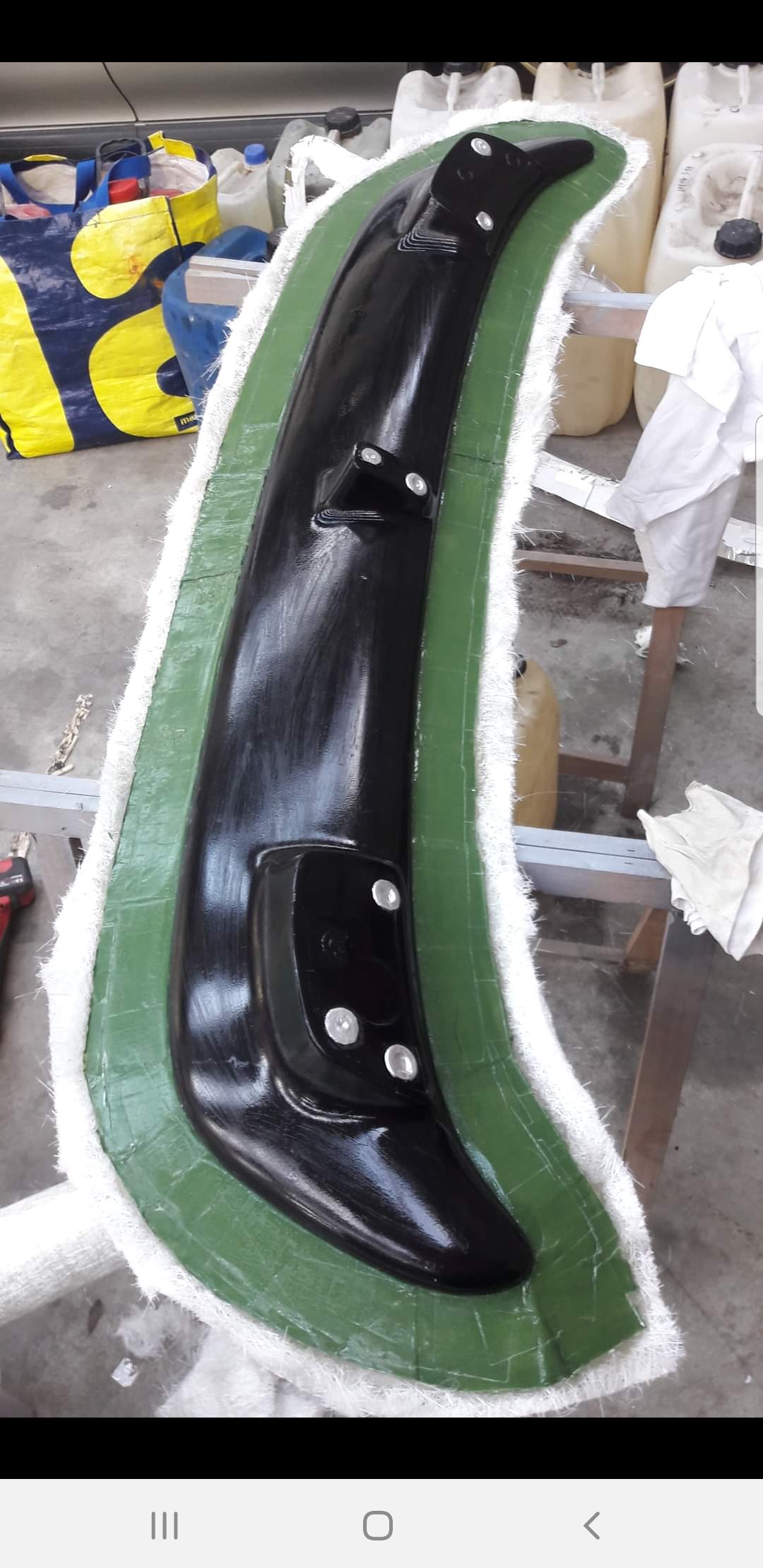 Collage des deux demi-ailerons puis stratification extérieure tout simplement. Ensuite ponçage-mastic-ponçage-peinture PU bi-composant si vous voulez que ça tienne un moment.
