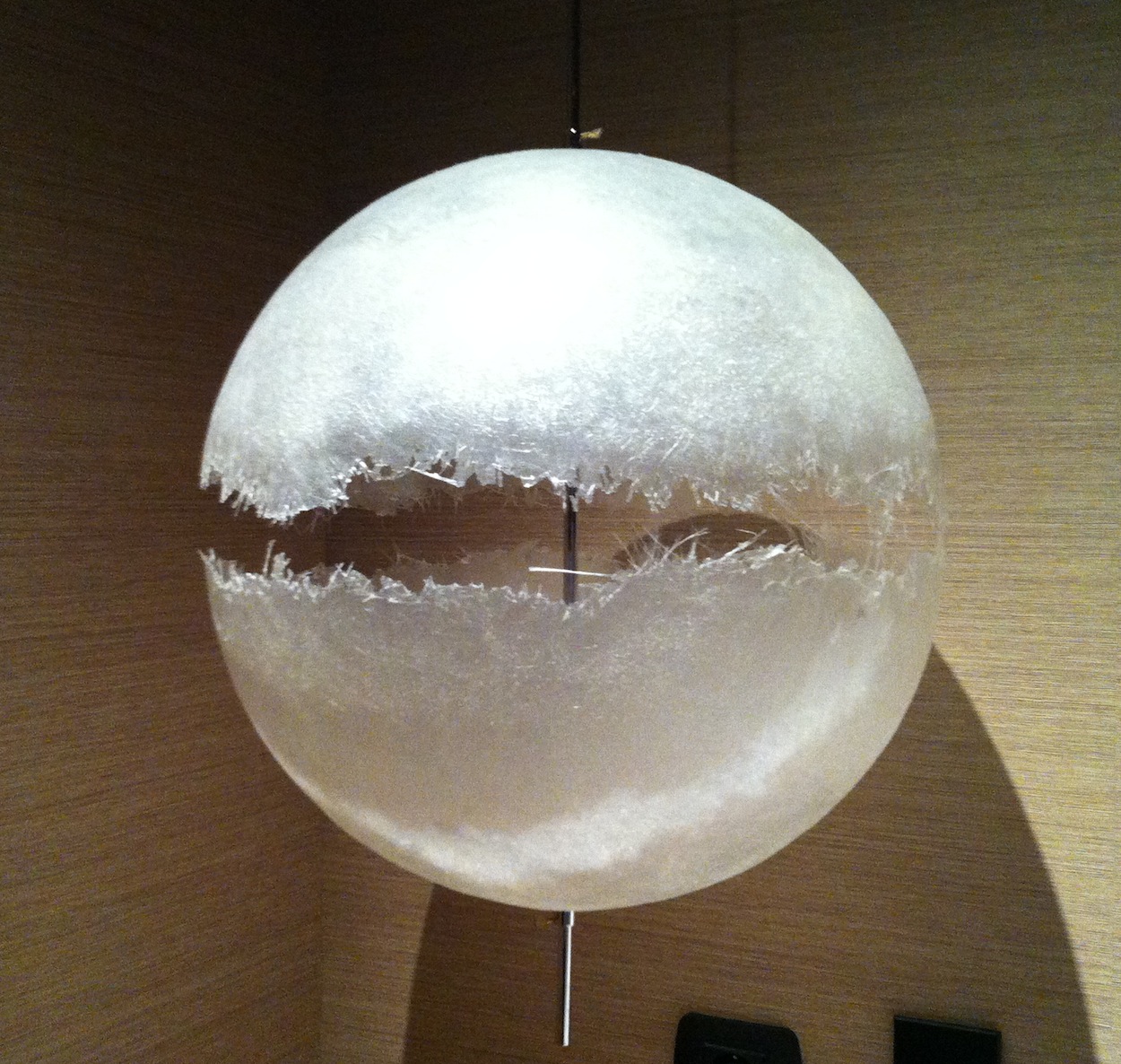 l'ampoule est à l'intérieur, au niveau du centre de la sphère (comme l'objectif était plus haut que la sphère, on ne la voit pas), d'ailleurs ce qui est sympa, c'est que quand on allume, les franges de fibre dessinent leur ombre sur les murs.